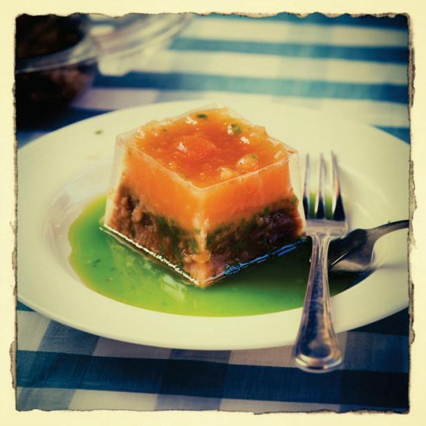 Completing the Journey: Pour the remaining gelatin mixture over the meat-infused layer, encapsulating the timeless essence within each cube. If desired, add a hint of edible gel color for a touch of retro charm.