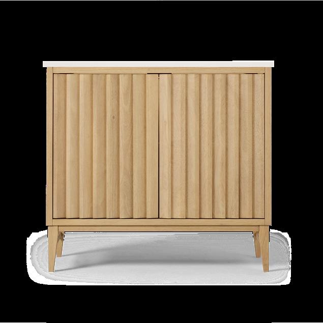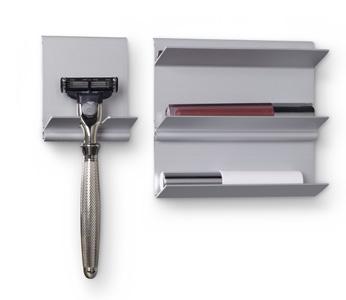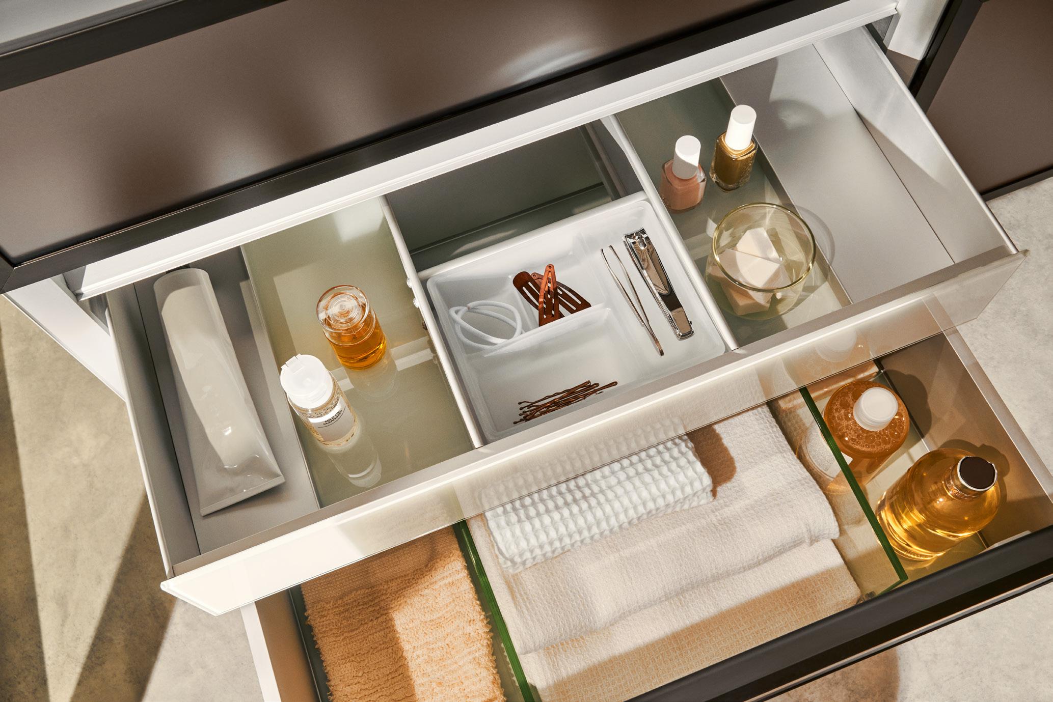 • Storage bins hold makeup brushes, cosmetics, and small grooming tools and keep them from spilling out of the cabinet.