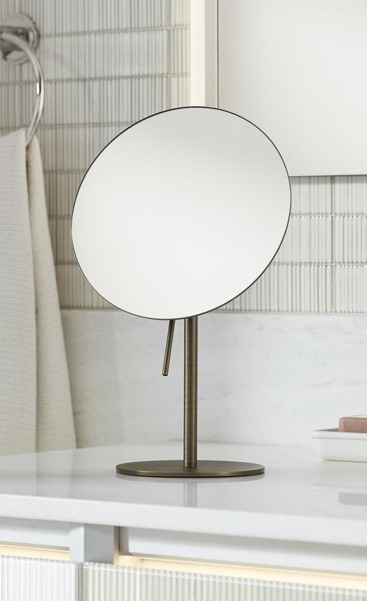 • An adjustable perimeter lit 5x magnification mirror with dimming functionality and selectable light temperatures makes close-up grooming tasks easy and convenient. The adjustable lit magnification mirror extends up to 13” outside of the cabinet and can tilt +/- 25 degrees for better viewing.