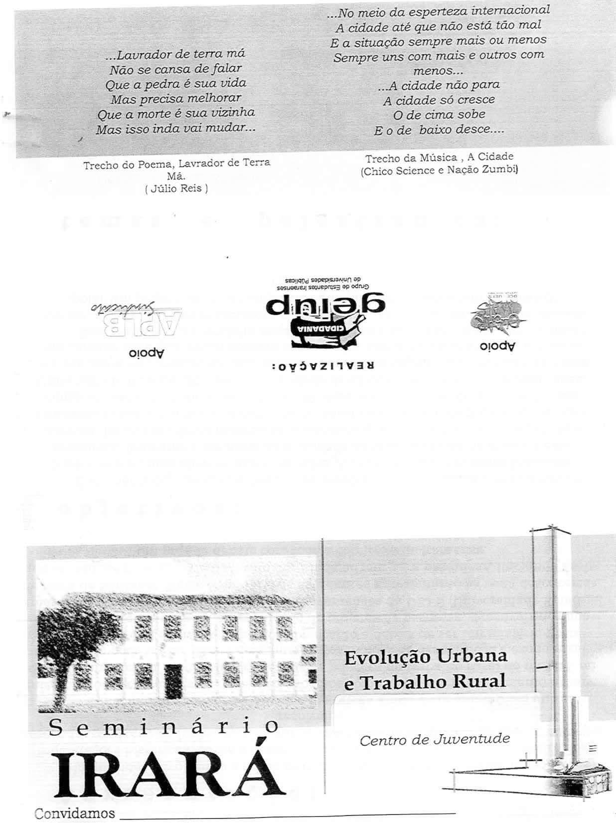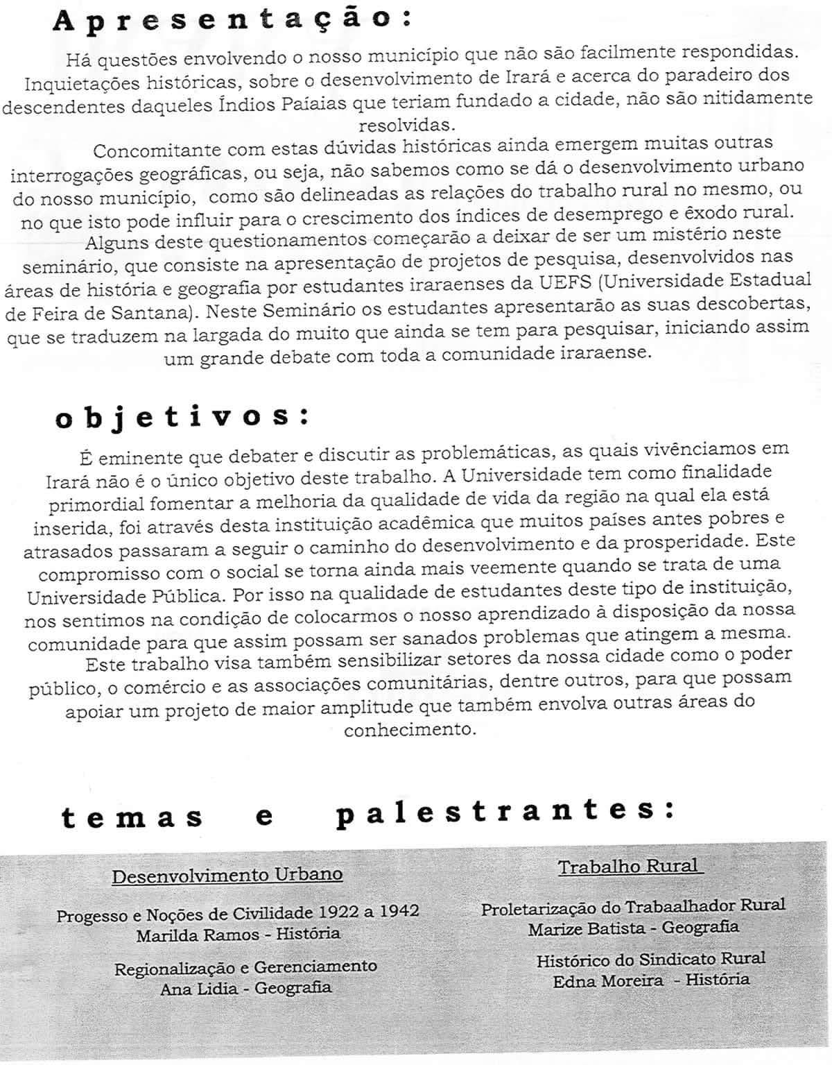 FOLDER SEMINÁRIO IRARÁ - EVOLUÇÃO URBANA E TRABALHO RURAL