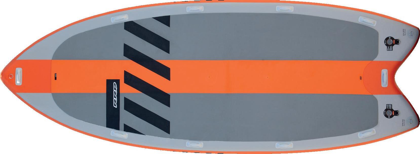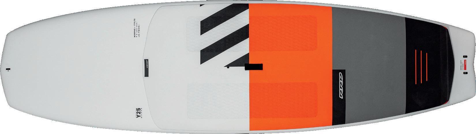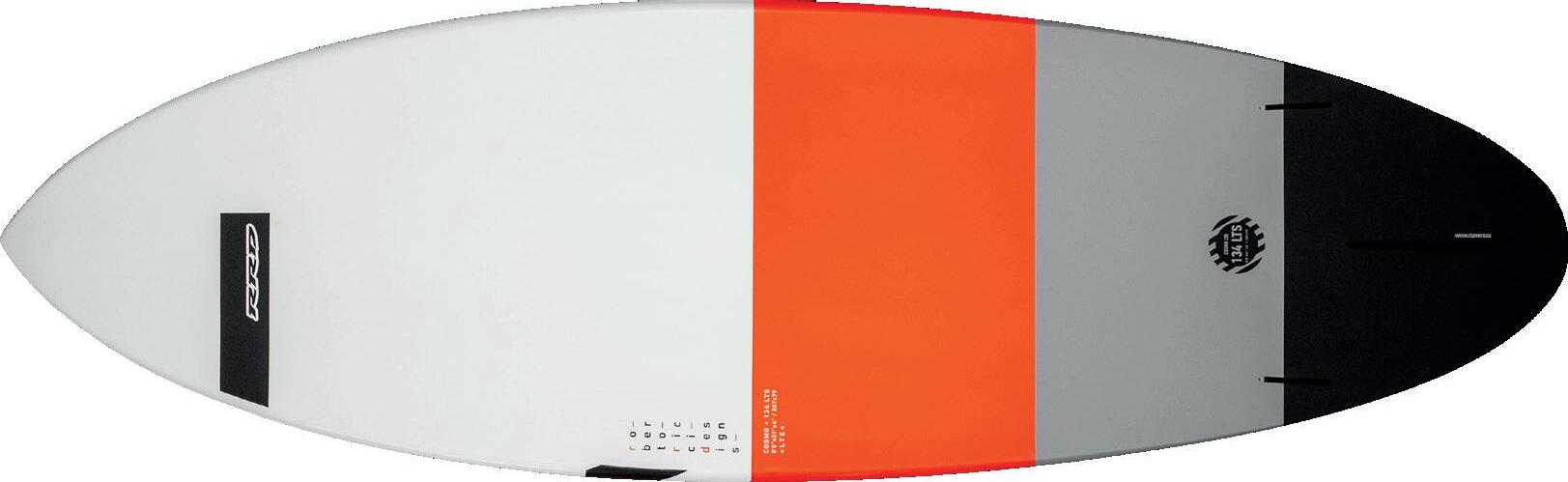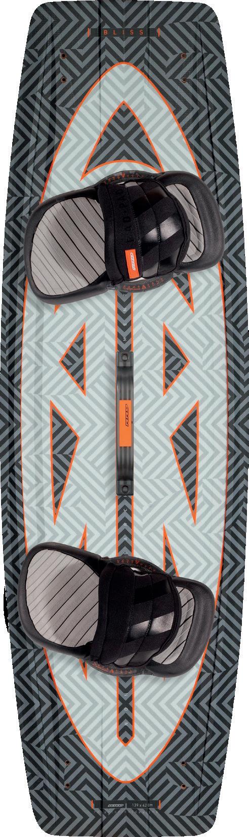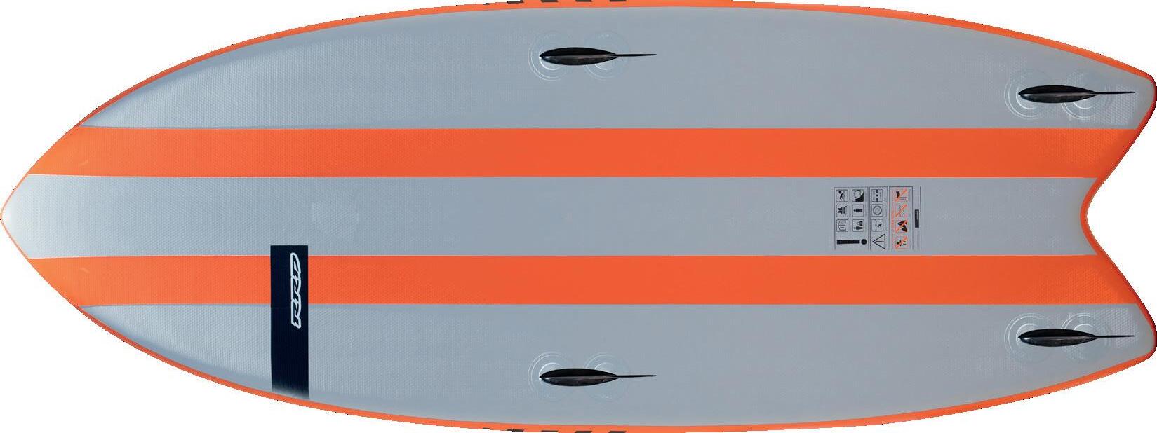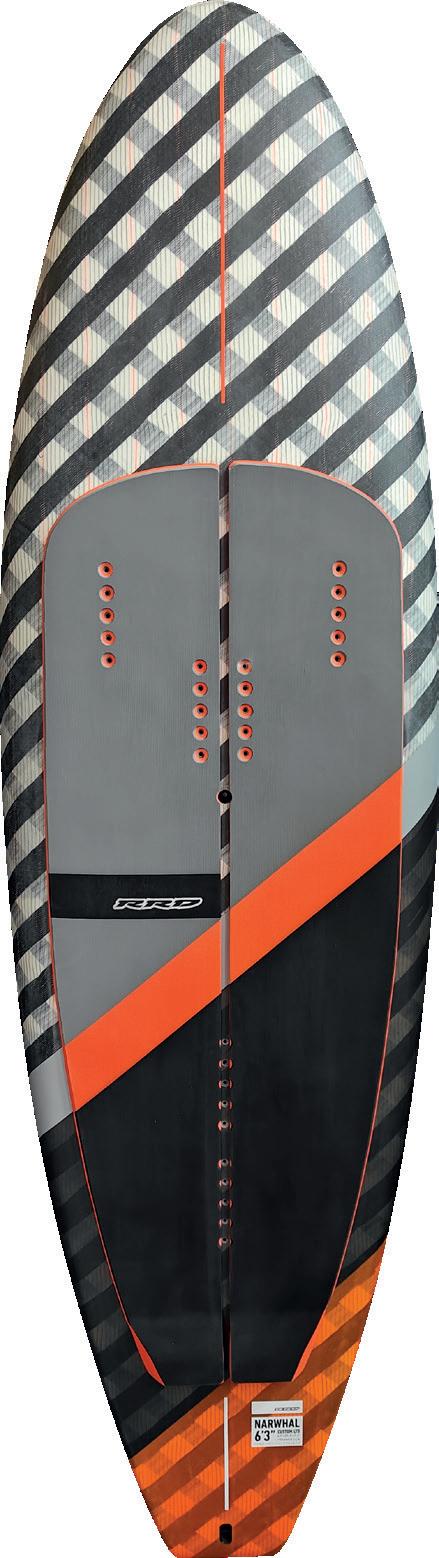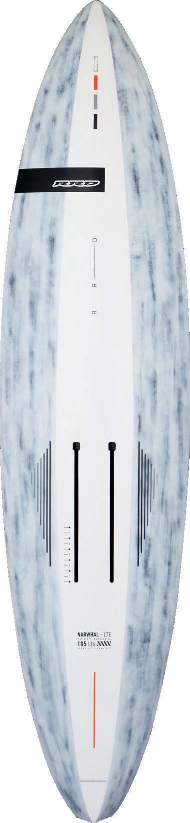 The streamlining of the nose maximizes the speed and offers trim control in upwind, the large top surface of the tail is covered by a thin layer of anti-slip for perfect grip during the extreme buoy turns. The new 14” has a special hydrodynamic prysm nose which allows to cut through the waves without any drag.