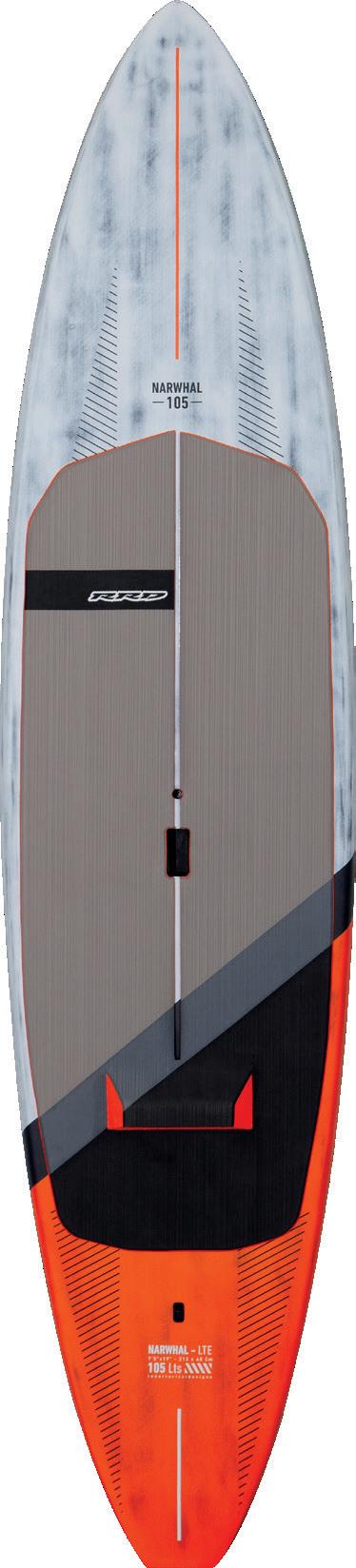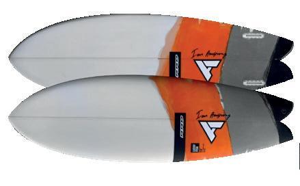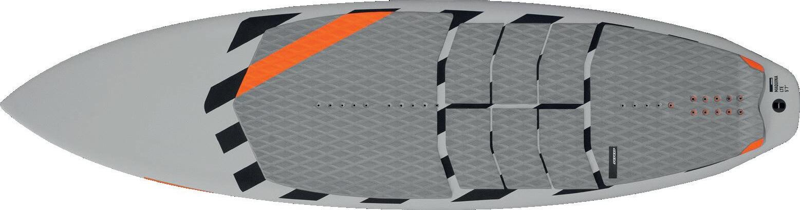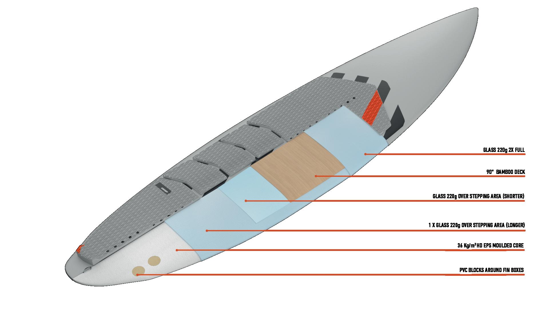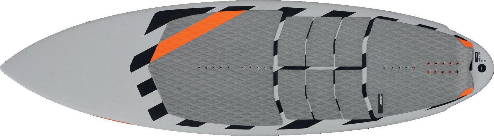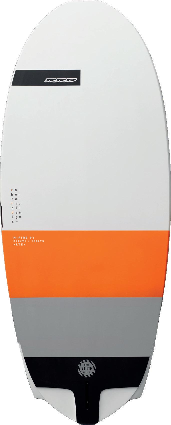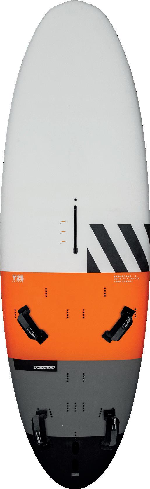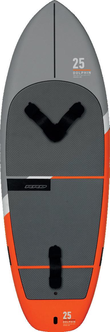 The streamlining of the nose maximizes the speed and offers trim control in upwind, the large top surface of the tail is covered by a thin layer of anti-slip for perfect grip during the extreme buoy turns. The new 14” has a special hydrodynamic prysm nose which allows to cut through the waves without any drag.