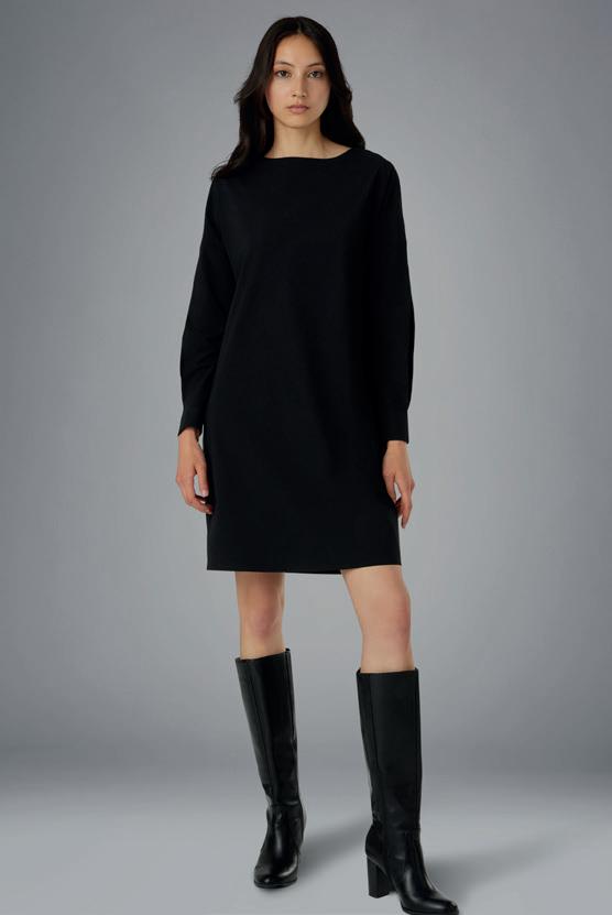 This above-the-knee and elbow-length sleeved garment is made with a hyper-flexible fabric with a super matte finish, providing elegance and grace. While worn with or without a belt, it fits perfectly beneath a blazer.