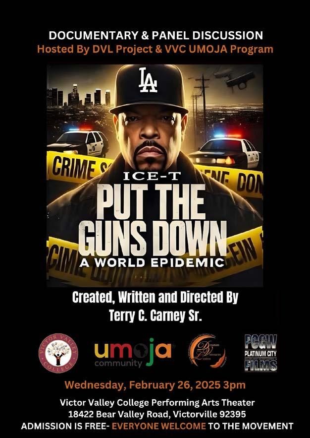 Victor Valley College (VVC) will host a special screening of the award-winning documentary Put the Guns Down: A World Epidemic on Wednesday, February 26th, 2025, from 3:00 PM to 6:00 PM at the VVC Performing Arts Center. This powerful event is presented in partnership with the DVL (Dreamers, Visionaries & Leaders) Project and VVC’s Umoja program. The screening will be followed by a panel discussion aimed at sparking critical conversations on the ongoing gun violence epidemic and its societal impact.