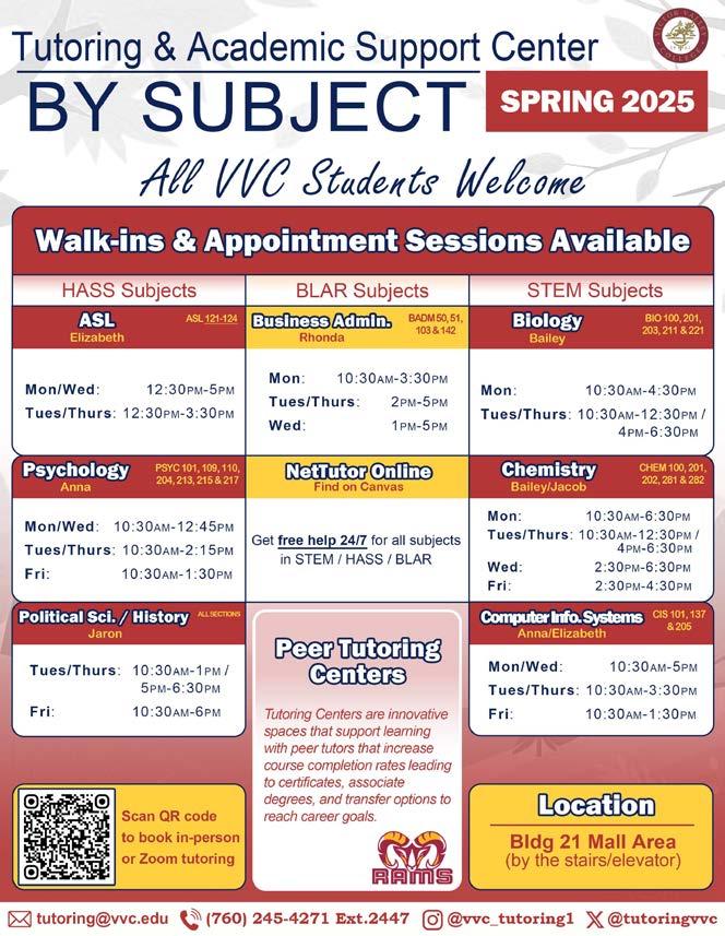 To support students in navigating the financial aid process, VVC’s Financial Aid Office offers workshops, informational sessions, and one-on-one assistance to help ensure applications are completed correctly and on time. Understanding financial aid can feel overwhelming, but with the right resources, students can make informed decisions about funding their education. Whether you’re a first-time college student, a returning learner, or transferring to a four-year university, now is the time to take advantage of the opportunities available. Investing in your education is one of the most important decisions you can make— let VVC help you take the next step. Visit the VVC Financial Aid Office or our website today to learn more and get started!