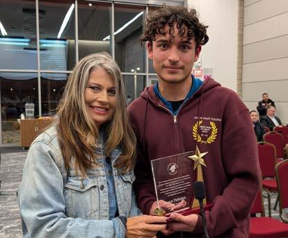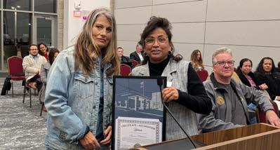 VVC BOARD OF TRUSTEE SHARON PINKERTON (LEFT ) RECEIVES A DEDICATION PLAQUE FROM VVC ASB EXECUTIVE SENATOR STEVEN GUEVARA ON BEHALF OF THE COLLEGE DURING A FEBRUARY 11, 2025 BOARD MEETING AT VVC’S EDUCATIONAL EVENT