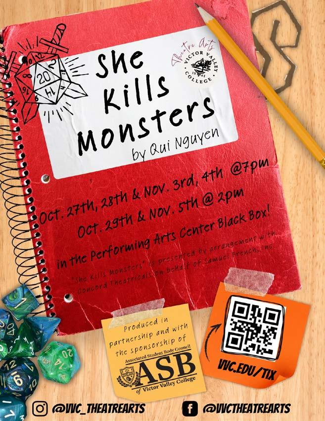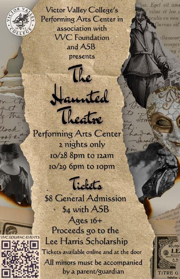 As the sun sets and darkness descends upon the PAC, VVC is ready to transport you into a world where secrets, spirits, and stories intertwine. This Halloween season, dare to explore the dark past and haunted present of Victor Valley College’s Performing Arts Center. Gather your courage, invite your friends, and prepare for an unforgettable night of spinechilling frights and enigmatic thrills. The