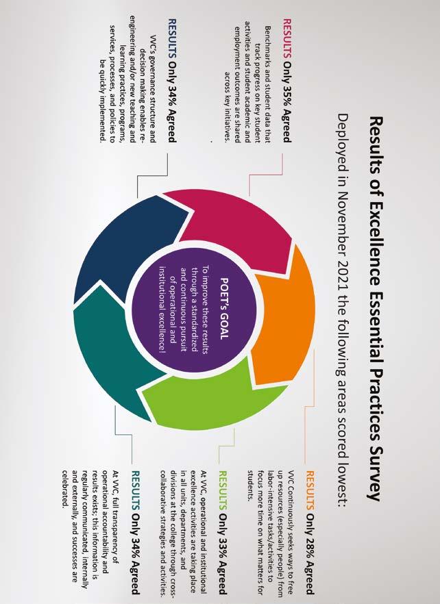 The Pursuit of Excellence Team was formed in response to the Results of the Excellence Essential Practices Survey, deployed in November 2021, which shed light on areas in need of improvement. Among the notable findings, the survey revealed that only 35% of respondents agreed that benchmarks and student data tracking were consistently shared across key initiatives. Similarly, only 34% agreed that VVC’s governance structure enabled swift implementation of new practices and programs.