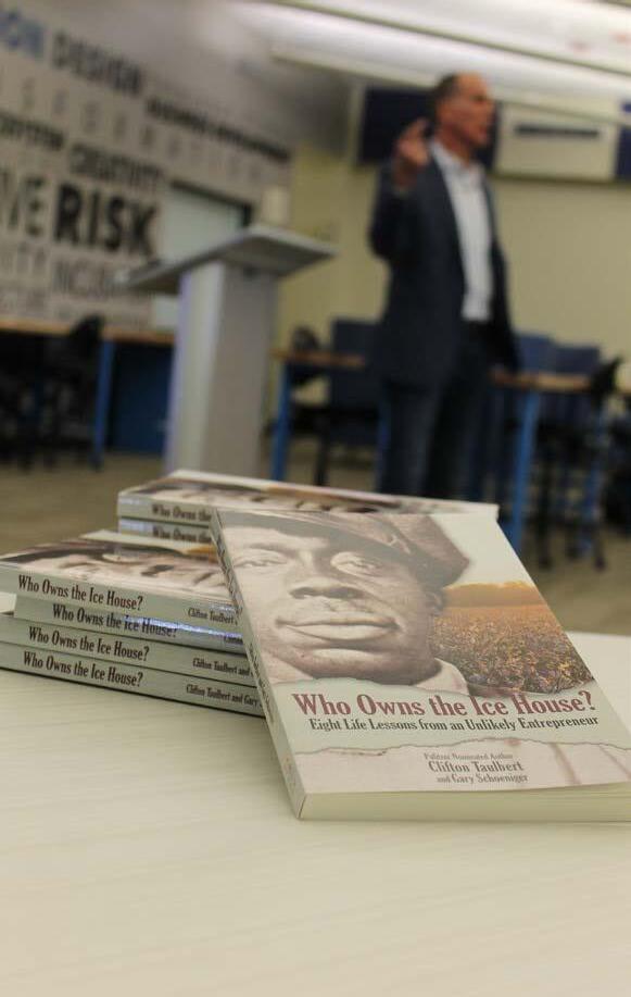 (Right Top) A photo of Schoeniger’s latest book “Who Owns the Ice House?” which was given away to several in attendance (Right Bottom) Schoeniger talks to students and staff at VVC about the value of Entreprenuership.