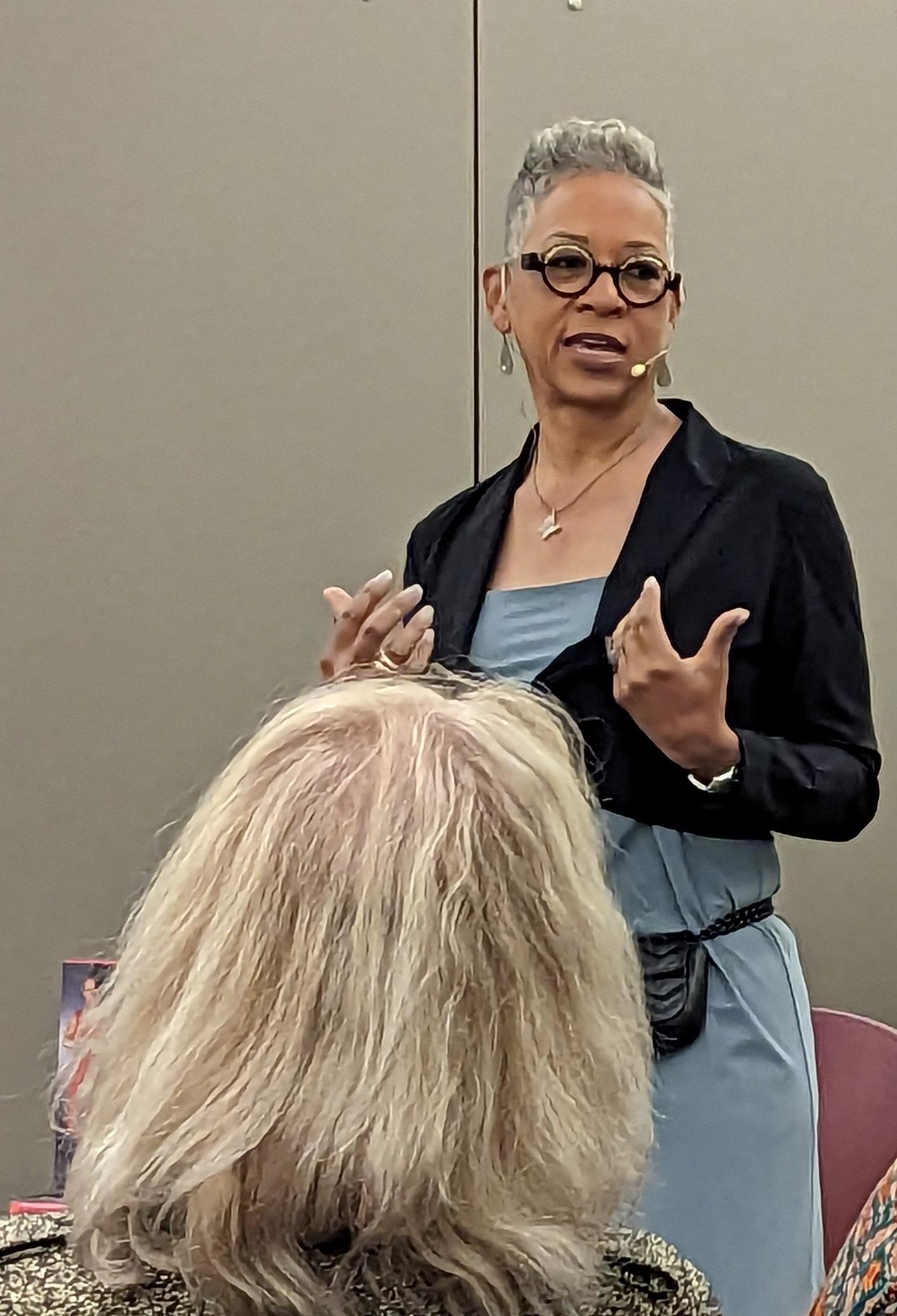 (Right) Tennis legend Katrina M. Adams speaks to community members at Victor Valley College about the importance of leadership in her career.