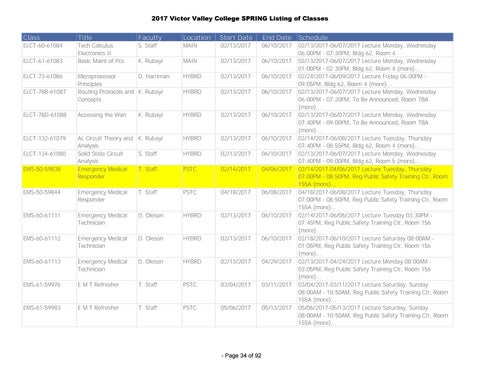 02/13/2017-06/07/2017 Lecture Monday, Wednesday 06:00PM - 07:30PM, Bldg 62, Room 4 02/13/2017-06/07/2017 Lecture Monday, Wednesday 01:00PM - 02:30PM, Bldg 62, Room 4 (more)... 02/24/2017-06/09/2017 Lecture Friday 06:00PM 09:05PM, Bldg 62, Room 4 (more)... 02/13/2017-06/07/2017 Lecture Monday, Wednesday 06:00PM - 07:20PM, To Be Announced, Room TBA (more)... 02/13/2017-06/07/2017 Lecture Monday, Wednesday 07:40PM - 09:00PM, To Be Announced, Room TBA (more)... 02/14/2017-06/08/2017 Lecture Tuesday, Thursday 07:40PM - 08:55PM, Bldg 62, Room 4 (more)... 02/13/2017-06/07/2017 Lecture Monday, Wednesday 07:40PM - 09:00PM, Bldg 62, Room 5 (more)... 02/14/2017-04/06/2017 Lecture Tuesday, Thursday 07:00PM - 08:50PM, Reg Public Safety Training Ctr, Room 155A (more)... 04/18/2017-06/08/2017 Lecture Tuesday, Thursday 07:00PM - 08:50PM, Reg Public Safety Training Ctr, Room 155A (more)... 02/14/2017-06/06/2017 Lecture Tuesday 03:30PM 07:45PM, Reg Public Safety Training Ctr, Room 156 (more)... 02/18/2017-06/10/2017 Lecture Saturday 08:00AM 01:05PM, Reg Public Safety Training Ctr, Room 156 (more)... 02/13/2017-04/24/2017 Lecture Monday 08:00AM 03:05PM, Reg Public Safety Training Ctr, Room 156 (more)... 03/04/2017-03/11/2017 Lecture Saturday, Sunday 08:00AM - 10:50AM, Reg Public Safety Training Ctr, Room 155A (more)... 05/06/2017-05/13/2017 Lecture Saturday, Sunday 08:00AM - 10:50AM, Reg Public Safety Training Ctr, Room 155A (more)...