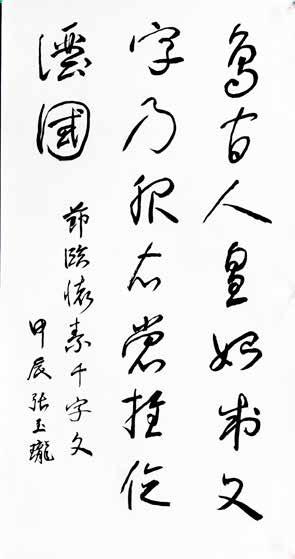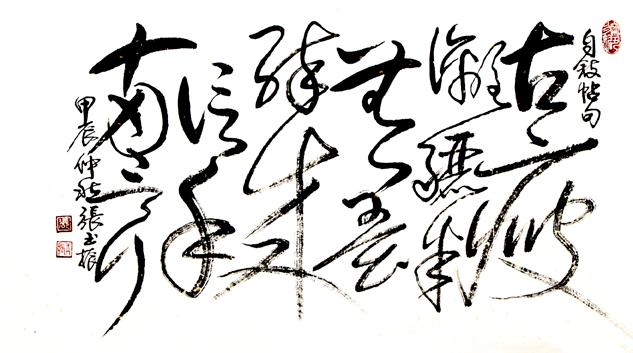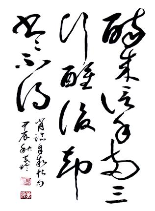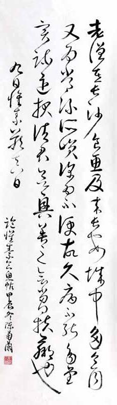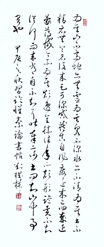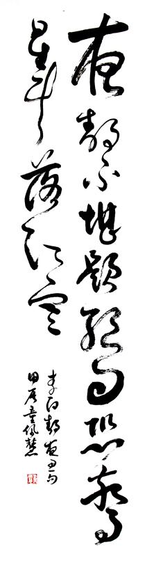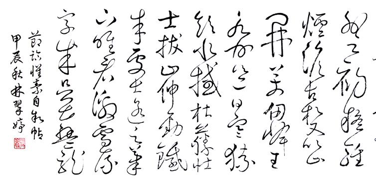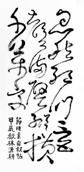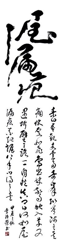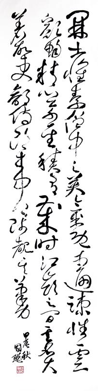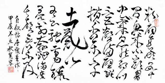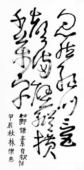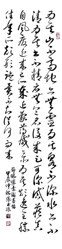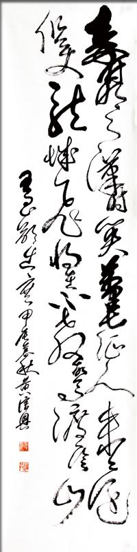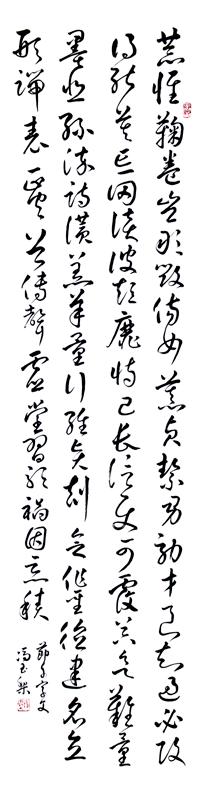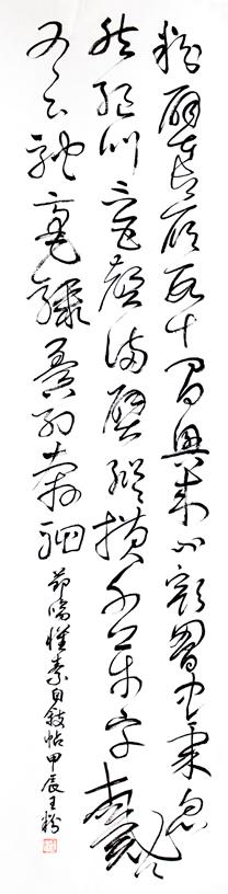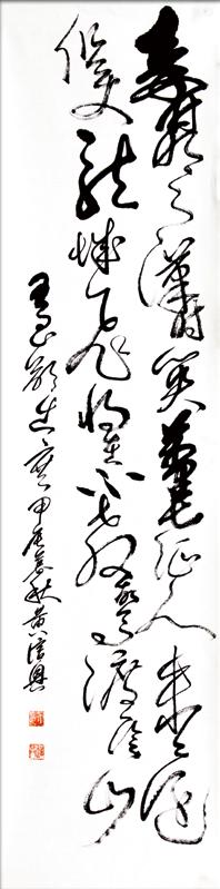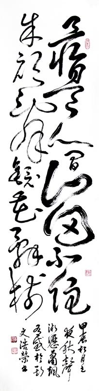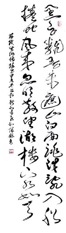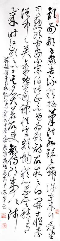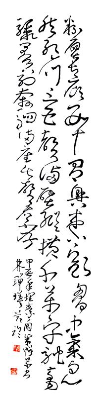 格式:條幅 書體:草書 出處:懷素《自敘帖》句 釋文: 粉壁長廊數十間,興來小豁胸中氣。忽然絕 叫三五聲,滿壁縱橫千萬字。 戴公又云:馳 毫驟墨列奔馳,滿座失聲看不及。