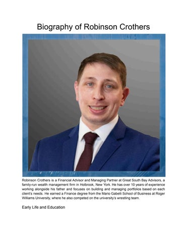 Robinson Crothers is a Financial Advisor and Managing Partner at Great South Bay Advisors, a family-run wealth management firm based in Holbrook, New York. With over 10 years of experience, he works closely with his father to guide clients through portfolio design and long-term planning. He graduated with a Finance degree from the Mario Gabelli School of Business at Roger Williams University, where he was also a member of the university’s wrestling team. Raised in Patchogue, New York, on Long Island, he grew up around the financial advisory profession. Over nearly a decade, he gained practical experience in portfolio management, client relationships, and long-term Financial Planning. After earning his degree, he worked as a Consultant in the Institutional Investment space, advising Pensions, Endowments, and Family Offices on constructing portfolios that included Private Equity, Hedge Funds, and other Alternative Investments. He then joined the family business, building on almost 10 years of hands-on experience managing client assets. The firm represents more than 50 years of combined family experience and rebranded from American Portfolios to Great South Bay Advisors in January 2025. As a fiduciary, he is committed to placing client interests first and providing advice free from proprietary product influence. His focus includes financial planning, retirement income strategies, and long-term investment management. He addresses return sequence risk by balancing equities and fixed-income investments to help protect retirement income during market volatility. Robinson's equity strategy compares dividend-paying stocks with growth-oriented companies, aiming for risk-adjusted returns while protecting capital during downturns. In taxable accounts, he emphasizes fixed income and municipal bonds. He also monitors long-term themes, including industrial innovation, semiconductor equipment, energy production and storage, and defense spending.