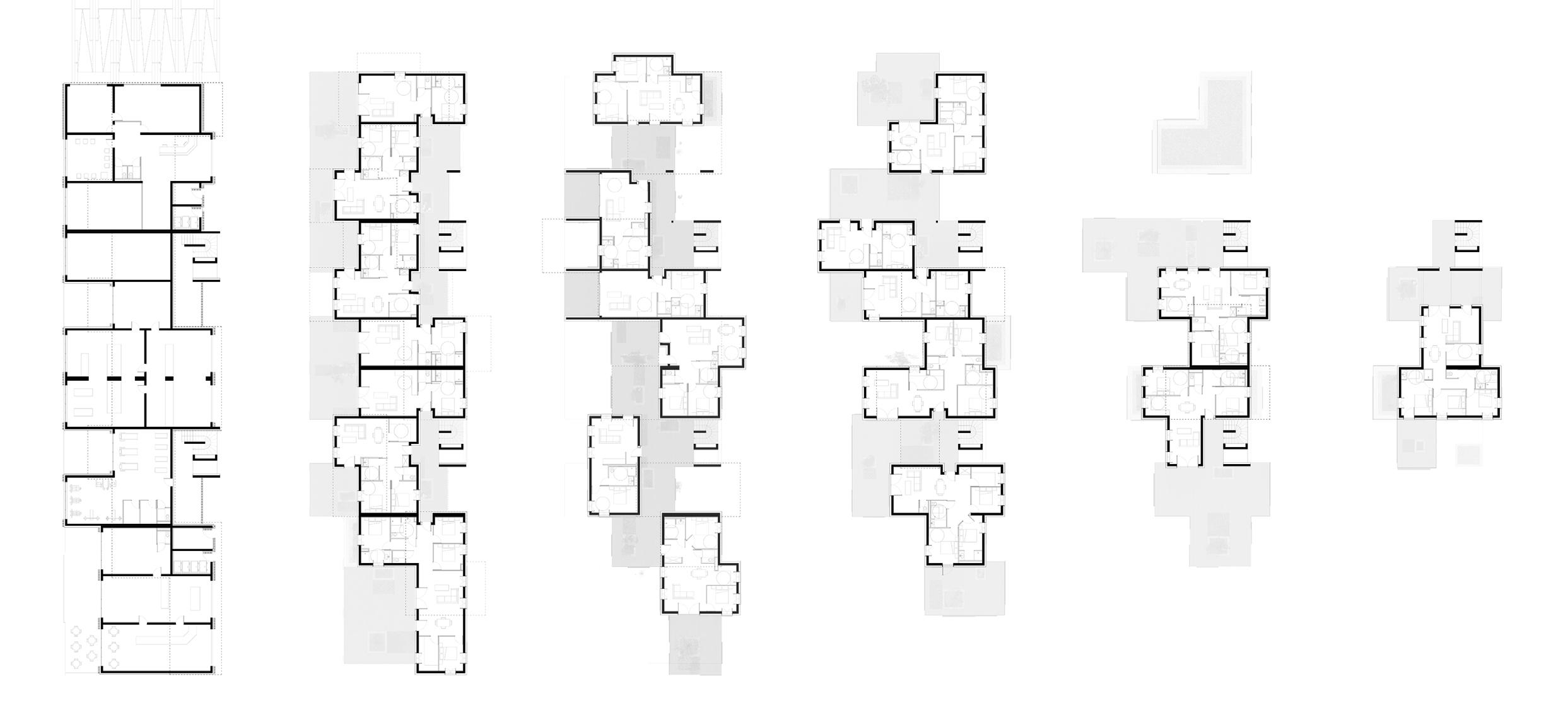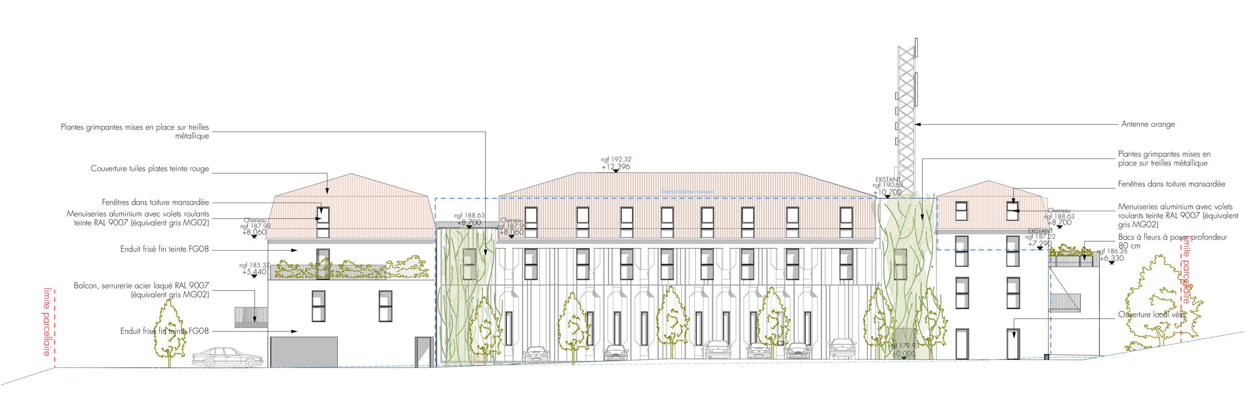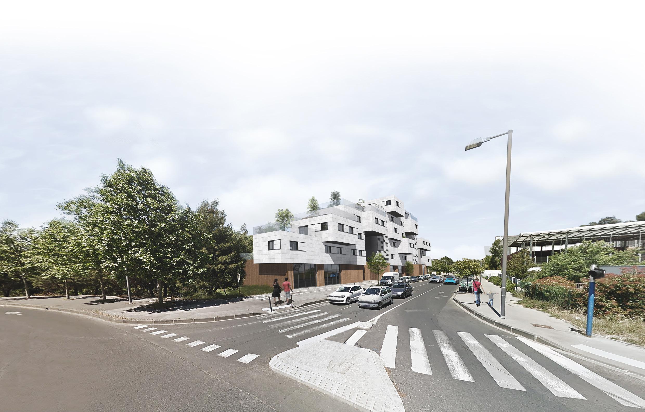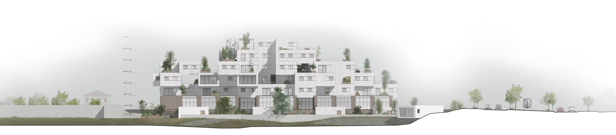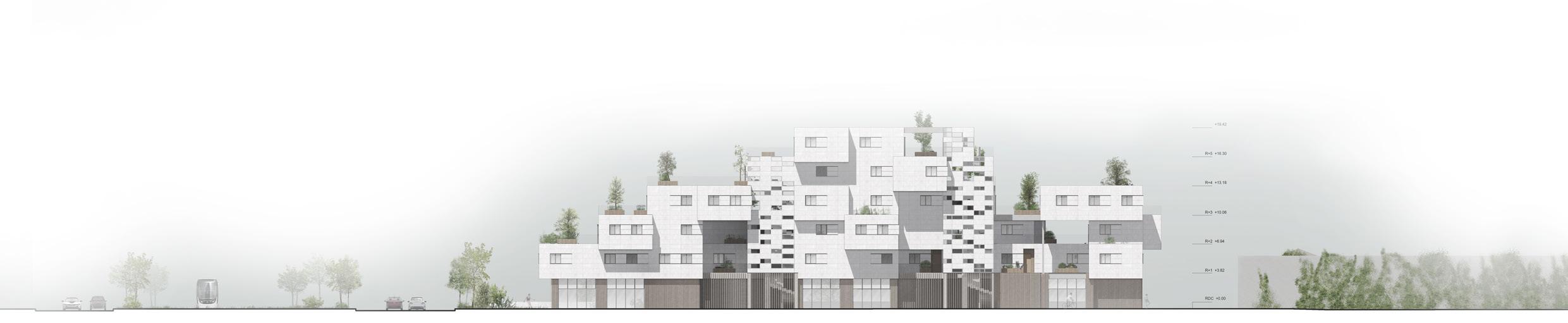 Le projet se nomme rocher hybride et l’objectif était que chaque logement soit unique créant ainsi un jeu de porte-à -faux. Ces porte-à -faux ont également pour objectif d’offrir à chacun des logements un espace extérieur généreux et planté. Un travail particulier à été effectué afin d’offrir une séquence d’entrée proche de celle d’une maison, ainsi on entre dans les logements par l’extérieur et chaque entrée possède un palier indépendant.