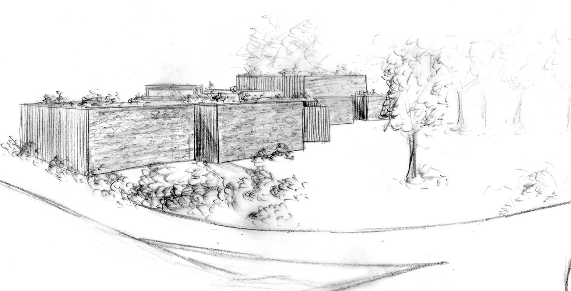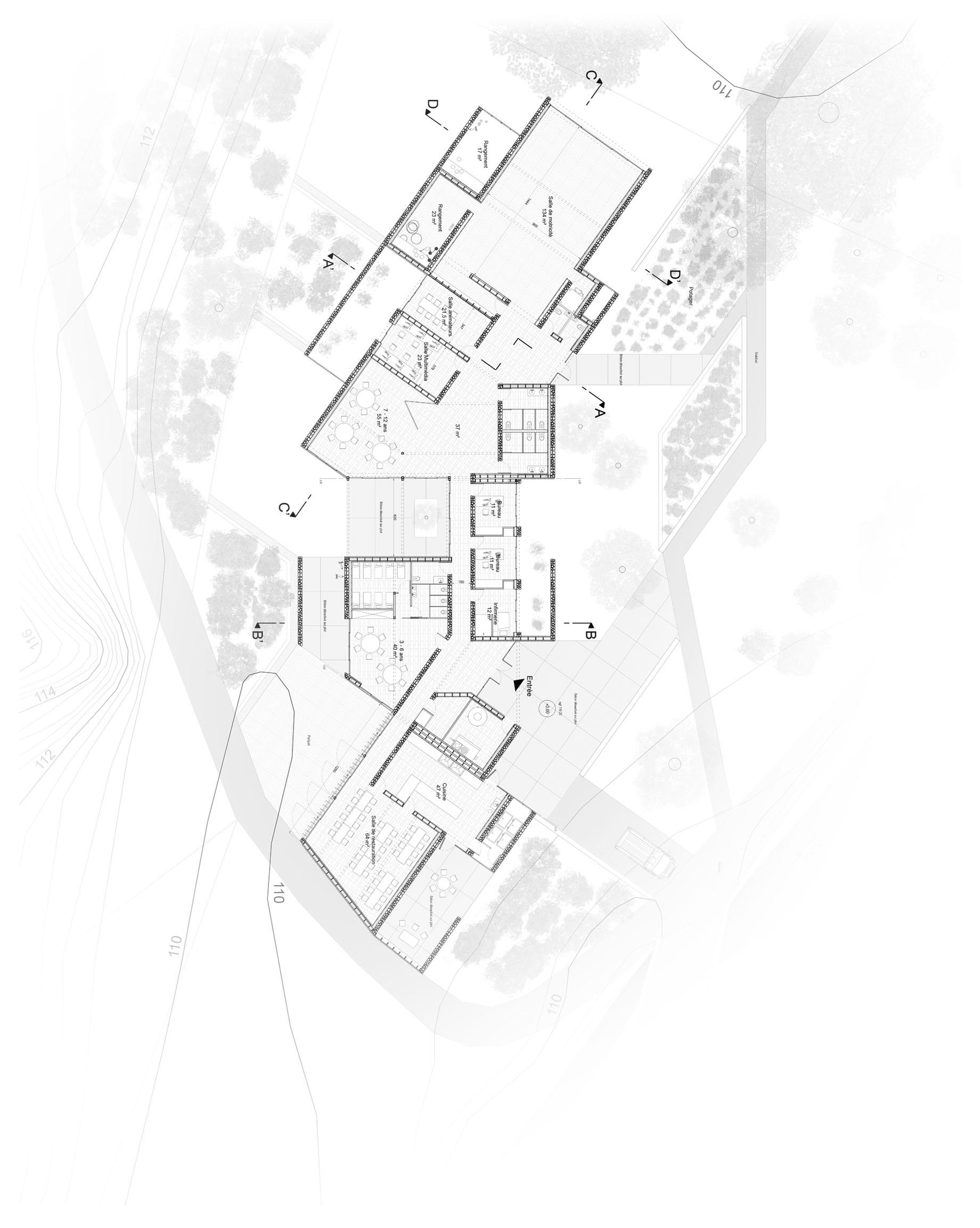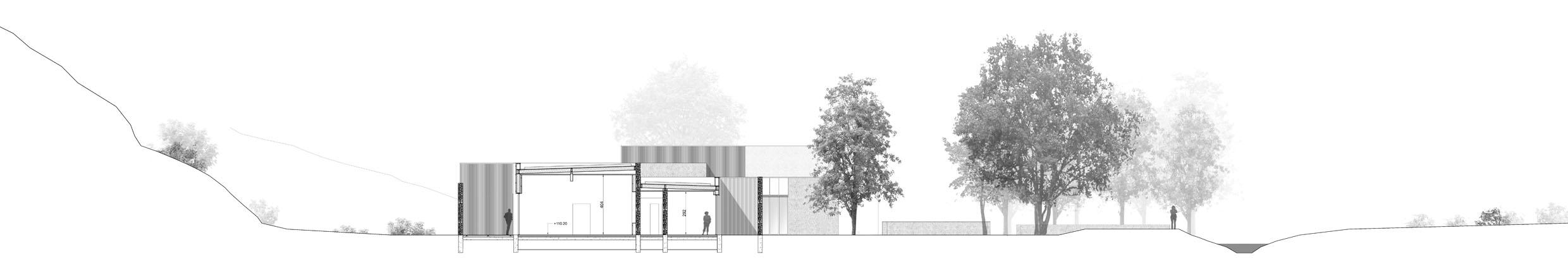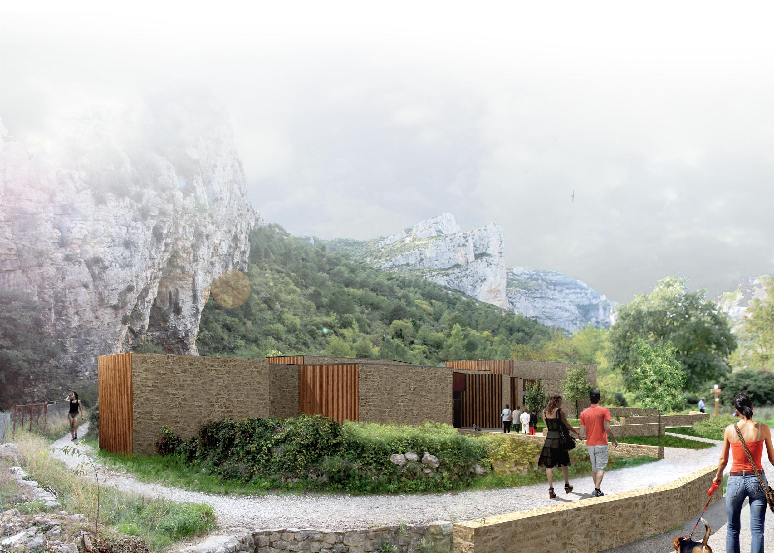 Le projet prend place dans le cirque Rocheux de Saint-Guilhem-le-Désert. Mon objectif était de me fondre dans le paysage et de créer un bâtiment en écho avec les affleurements rocheux et la végétation du site. Pour se faire j’ai travaillé sur deux compositions de murs en moellons jointés à la chaux et en bois. Les ouvertures dissimulées permettent de renforcer l’intégration.