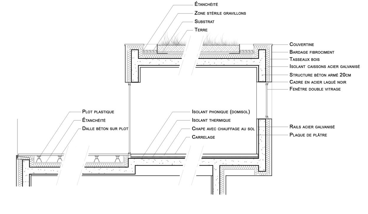 L’objectif étant de développer un projet simple, minimaliste, il est de plain pied, avec une toiture simple pan et la mise en oeuvre est pensée pour permettre l’auto-construction