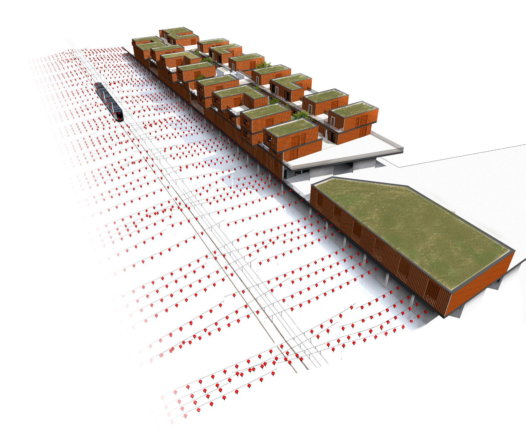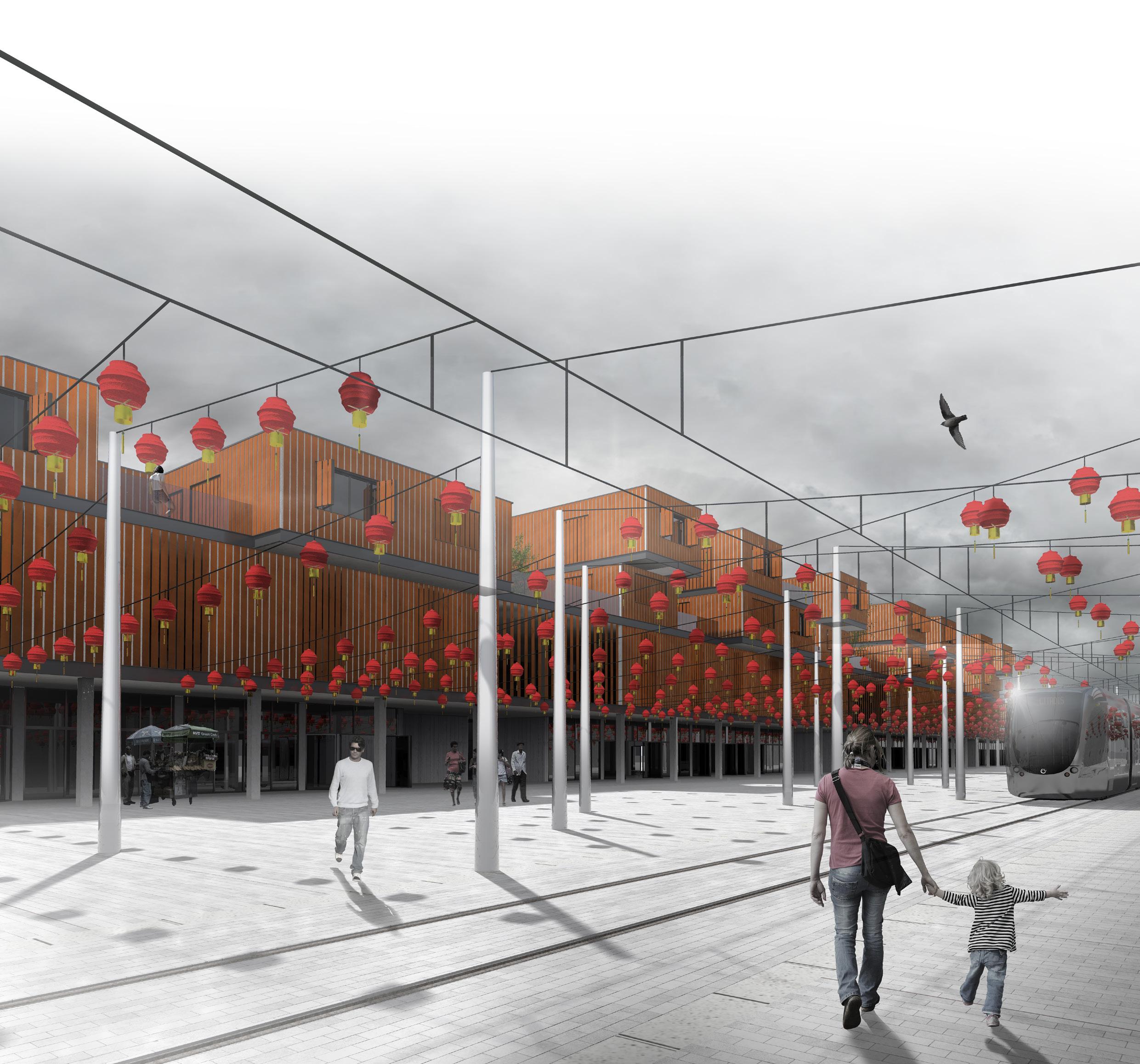 Le projet ci-contre est un bâtiment mixe de commerce, marché, logement, espace public surélevé le long d’une avenue rendue au piéton au vélo et aux transports en commun.