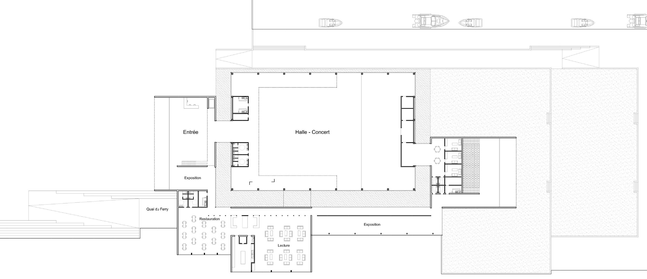 Le programme à été retravaillé afin d’être adapté à l’idée d’un projet qui se traverse et se vit comme une succession de séquences. Il contient une halle de concert, un restaurant un espace lecture, un amphitéâtre et 3 espaces d’expositions, chaque espace ayant des ambiances lumineuses distinctes.