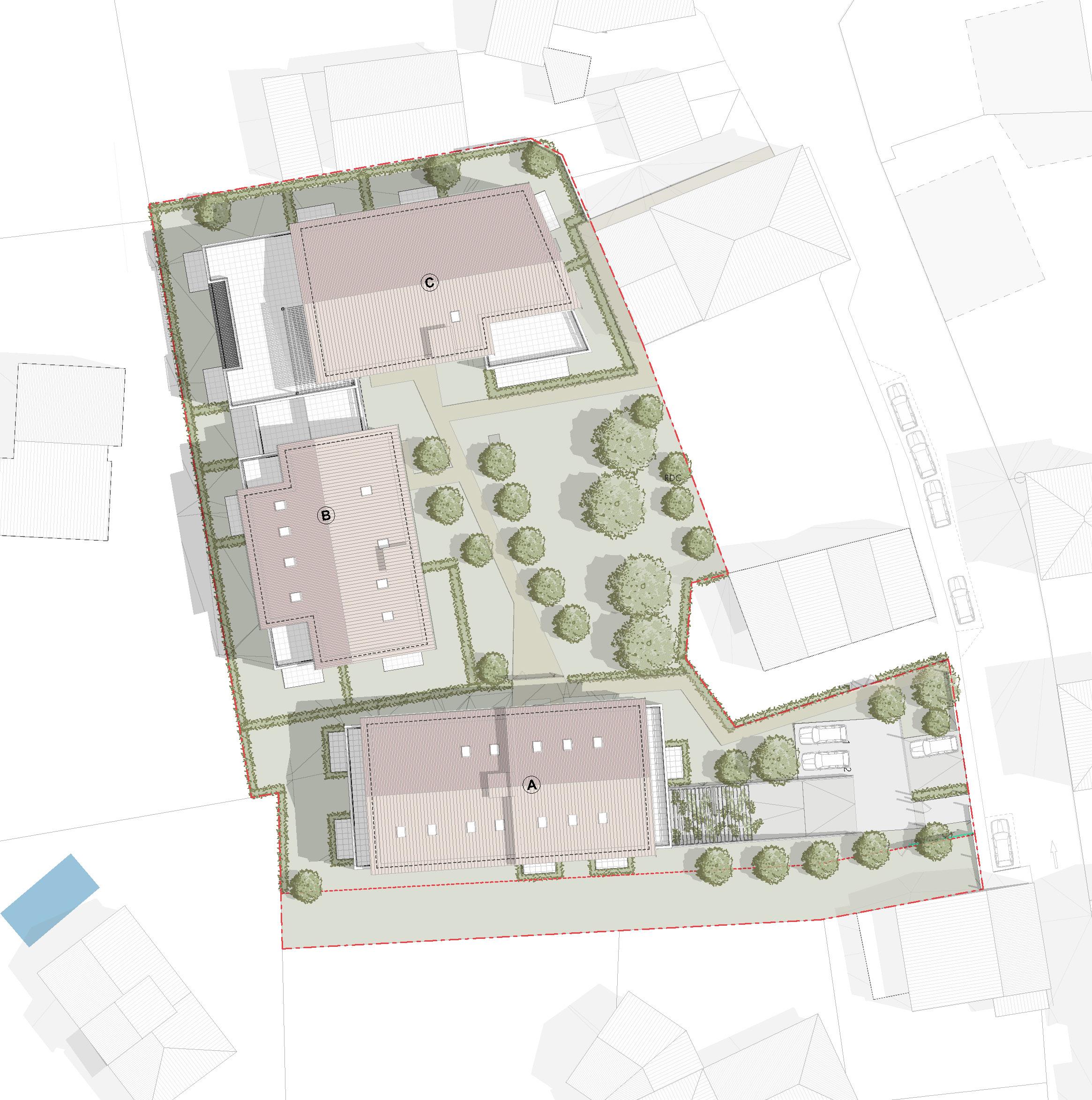 Le terrain offrait deux façades très urbaines au sud et à l’est. à l’ouest le terrain offrait un paysage boisé dans lequel passe un ruisseau, ce bois étant non contructible et protégé.