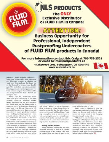 operators. “From personal experience, I know that proper safety gear can make the difference between a collision you walk away from and one that lands you in the hospital or worse,” said Lundrigan. “Eye protection prevents momentary blinding, protective clothing protects you from serious scrapes if your bike slides and everyone knows that a helmet can save your life.” Safety tips for motorcycle riders Make sure your motorcycle is in good working condition, including rubber, brakes and lights that are working properly. Being seen, and the ability to stop or maneuver out of a dangerous situation is often your best defense. Motorcycle riders should have an up-to-date motorcycle inspection to ensure good tire condition and braking/steering/suspension components. Always ride closer to the center line, rather than the middle of the road and shoulder, so you can see oncoming traffic more easily and they can see you. Pay attention to the road and never drive while impaired or distracted. Ride according to your skills and ability. Avoid riding in bad weather; wet roads are dangerous on two wheels. Consider taking a motorcycle safety course to learn more about 20