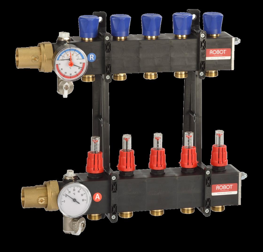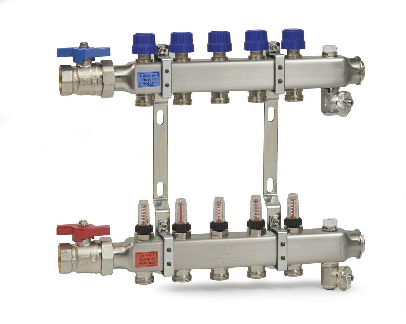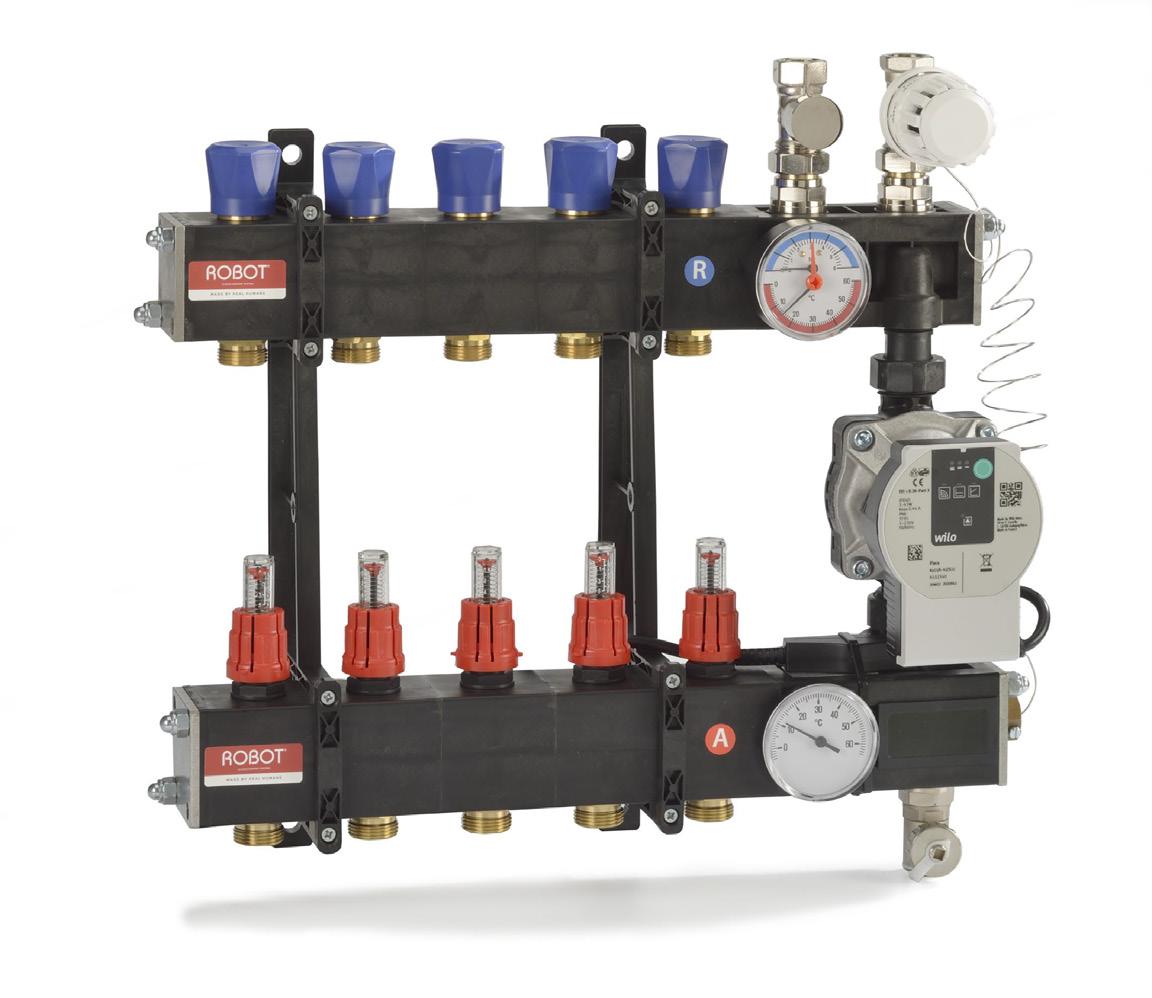 De ROBOT LTVC is een composiet verdeler met pomp. De verdeler van composiet is geschikt voor systemen met een hoge- en lage aanvoertemperatuur. De ROBOT LTVC verdeler is voorzien van een inregelventiel, waardoor het mogelijk wordt om de vloer-retourstroom in te regelen. In combinatie met deze composiet verdeler uitsluitend diffusiedichte buis toepassen, conform DIN 4726.