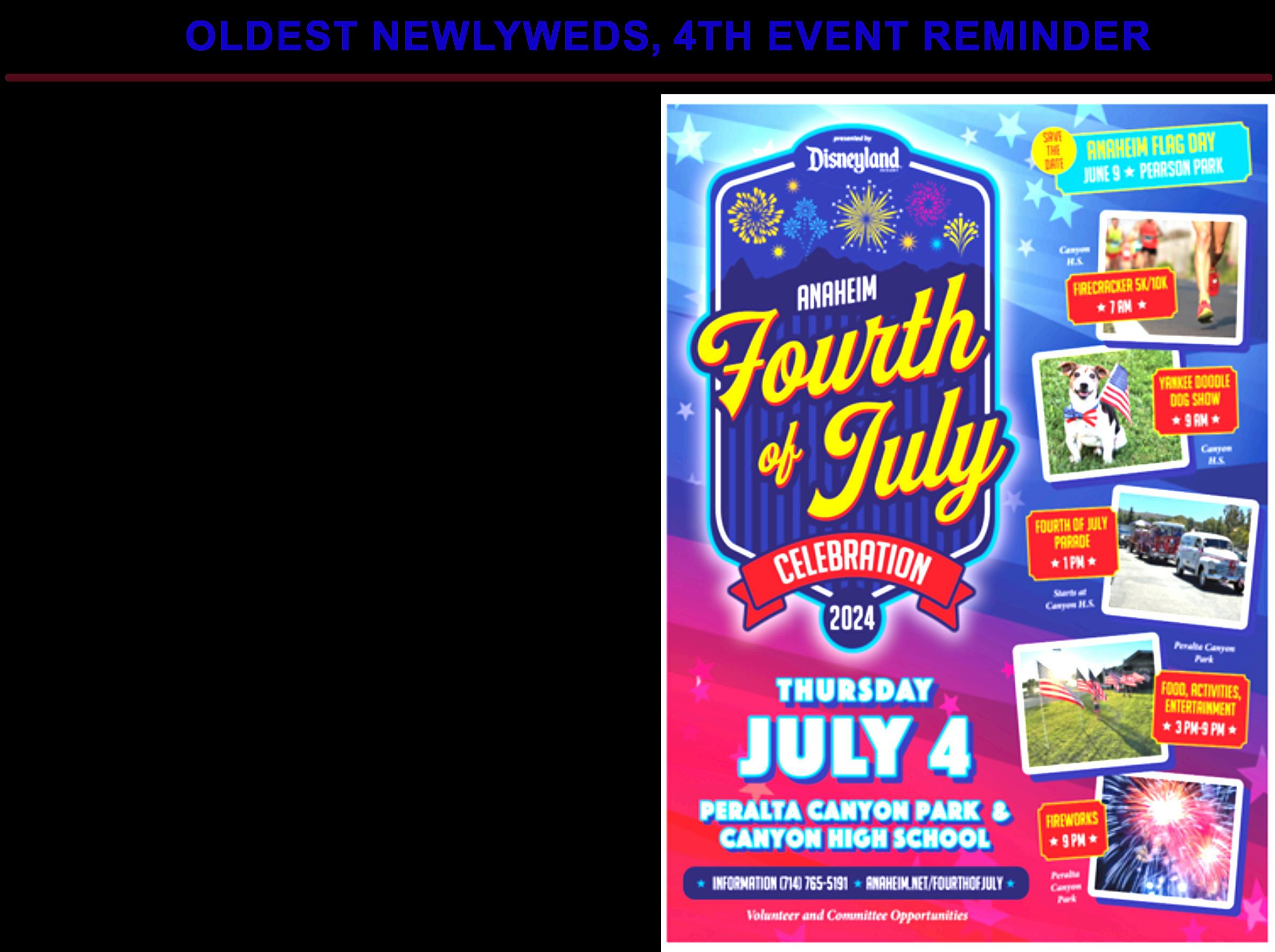 Coming inJuly isthe bigcity-wide 4th of July festivities in the East Anaheim area, including the dog show. Many of us volunteered and worked last year checking the dogs and their human escort into the event. It was fun to see the dogs in costume, everyone had a great time. If you are interested in volunteering this year, please leave your name and phone number with the receptionist and we will contact you with more details. For those volunteering, round trip transportation will be provided from the downtown senior center to the event. Come have fun with us.