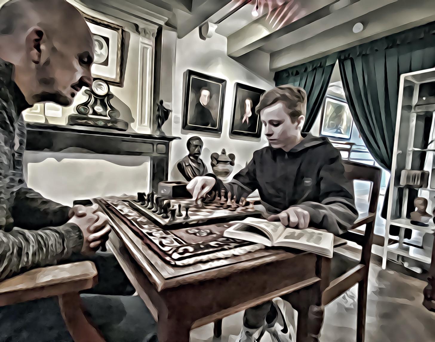 Ze speelden een spelletje met het schaakspel dat in een vitrine stond. Max’ vader was een goede schaker. Hij had een boekje gekocht over schaakpartijen die Dek had gespeeld via postkaarten. De post kwam vroeger een paar keer dag. Dek schreef dan de zet op die hij wilde doen en stuurde een kaart naar zijn tegenstander. Die vulde de tegenzet in en zo ging de kaart heen en weer.