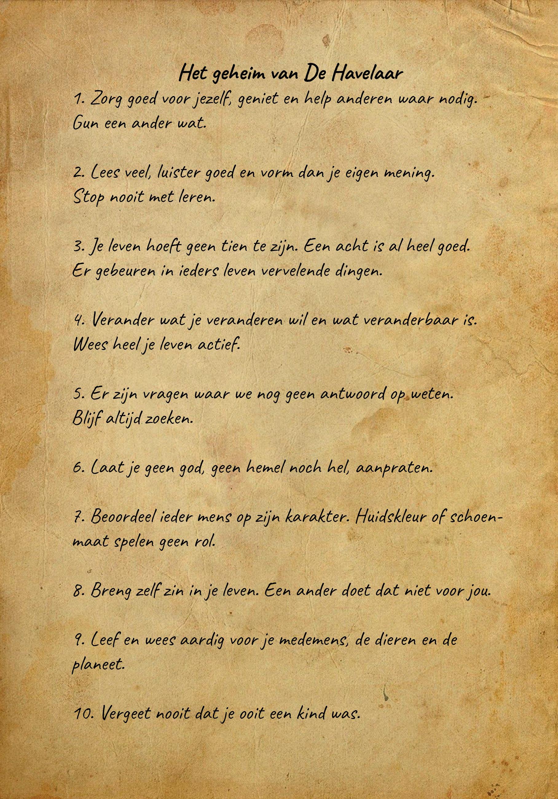 Jij hebt Max en Wouter. Het geheim van De Havelaar nu in handen. Lees het snel uit en geef het dan door aan een andere slimme leeftijdgenoot die je kunt vertrouwen. En vergeet nooit, nooit wat de volwassenen wél vergeten zijn, toen ze ouder werden. Ik reken op je!