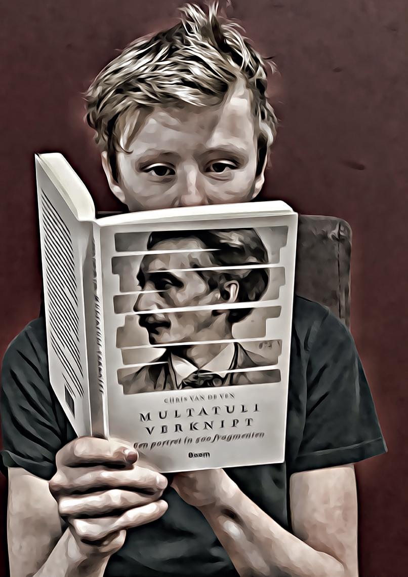 Alle Nederlanders mopperden op corona, maar voor de familie Versteegh was het ideaal. Max had nu alle tijd om te lezen, te luisteren, te kijken en het internet af te speuren. Het lezen ging steeds sneller. Lekker met een boek op de bank. Vader aan de eettafel, met zijn laptop voor zich, plaatste de ene na de andere bestelling en dan werd een dag of wat later het zoveelste pakketje met extra boeken bezorgd. Moeder maakte overzichten over wat ze hadden gelezen en bekeken. Ze probeerden alle drie zoveel mogelijk hetzelfde te lezen. De familie leek wel een grote spons die zoveel mogelijk kennis over Dek opzoog. Max keek af en toe naar zijn ouders terwijl die druk bezig waren. Dan gaf hij Wouter een beuk die dan steevast zei: ‘Je boft met die twee!’ Hij bofte inderdaad met zijn ouders en ook zeker met zijn oudgrootvader. Als Max een positief stuk over Dek las dan werd hij warm van binnen. Was het negatief, Dek kon er soms ook echt wel een potje van maken, dan snapte Max dat ook wel. Hij las wel honderd keer dat Dek ‘een vat vol tegenstrijdigheids’ werd genoemd. Dat was hij zeker. De achterkaft van Multatuli Verknipt had Max gekopieerd en op zijn aantekeningenschrift geplakt.