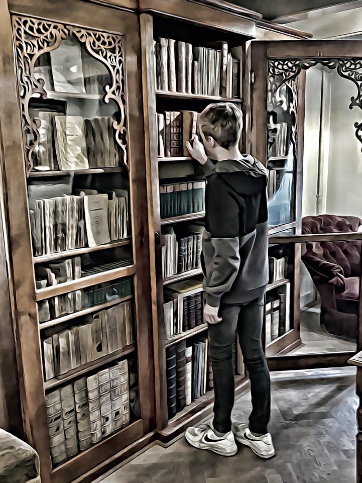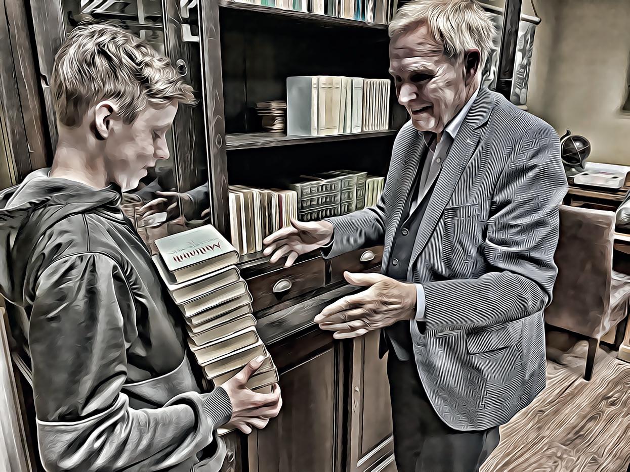 -Max zet de gekregen boeken terug in de boekenkast van zijn oudgrootvader.-