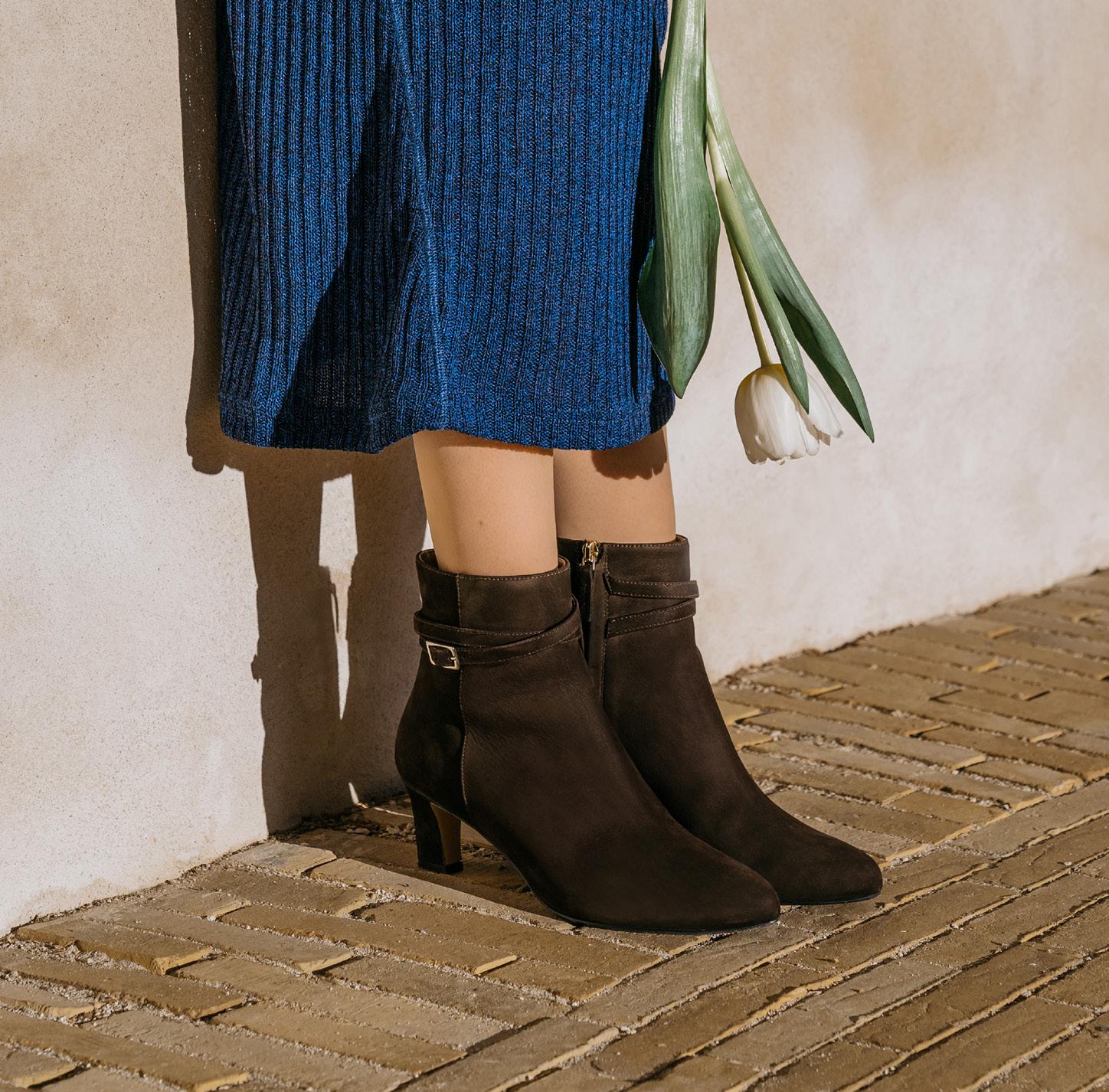 A beautiful and elegant ankle boot made of suede, with a beautiful strap around the ankle. Great to wear, thanks to the unique, scientifically validated orthopedic insole that helps relieve the pressure on your feet. Her beautiful brown color can give an extra touch to a black look and stands out from all the black boots. With a 5 cm heel, she is ideal for a day at the office or out on the town.