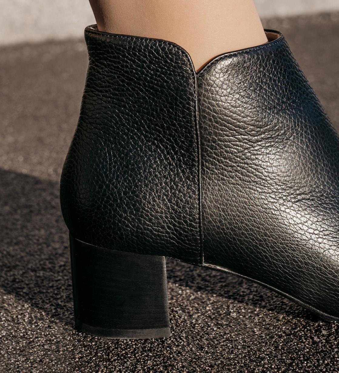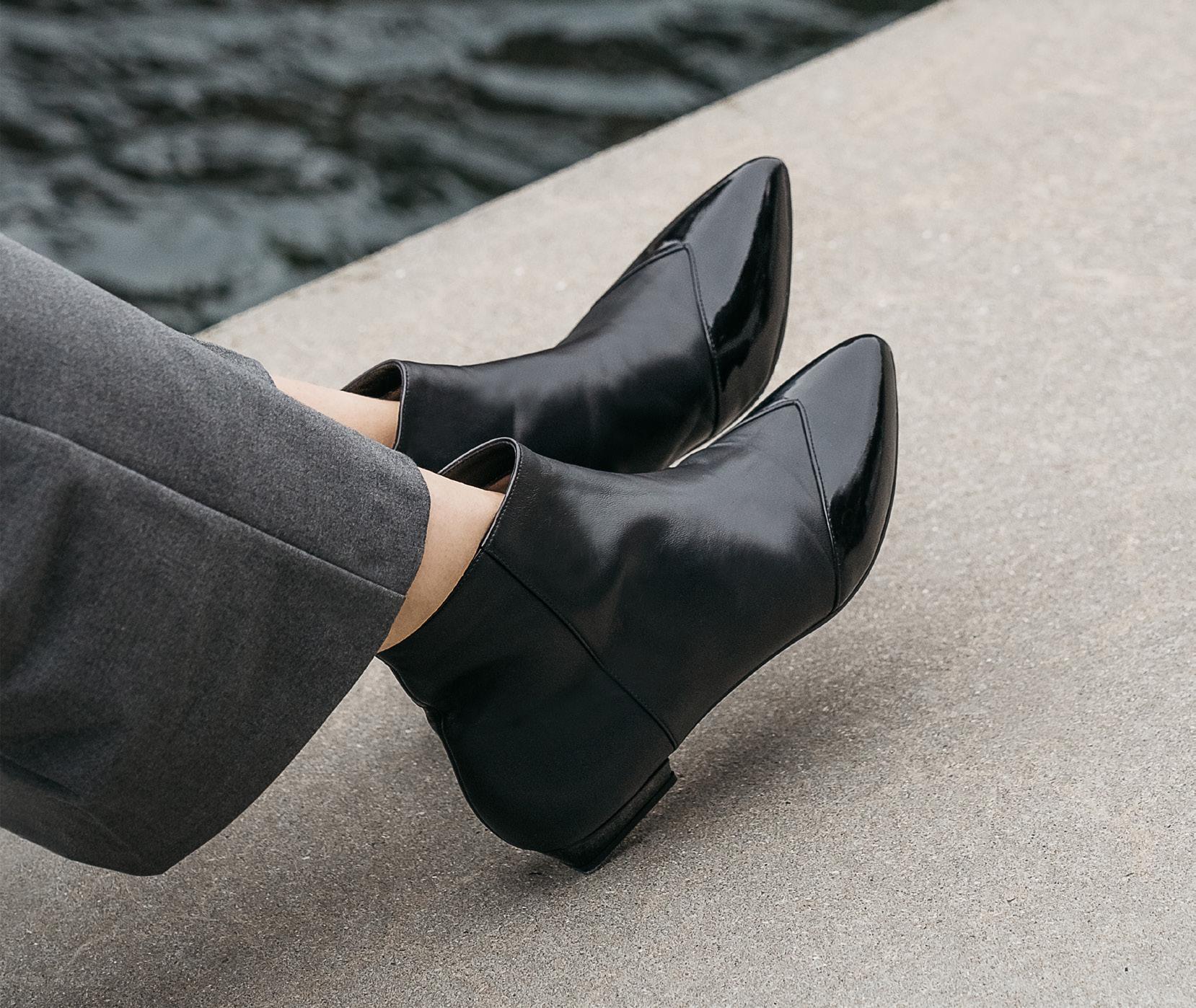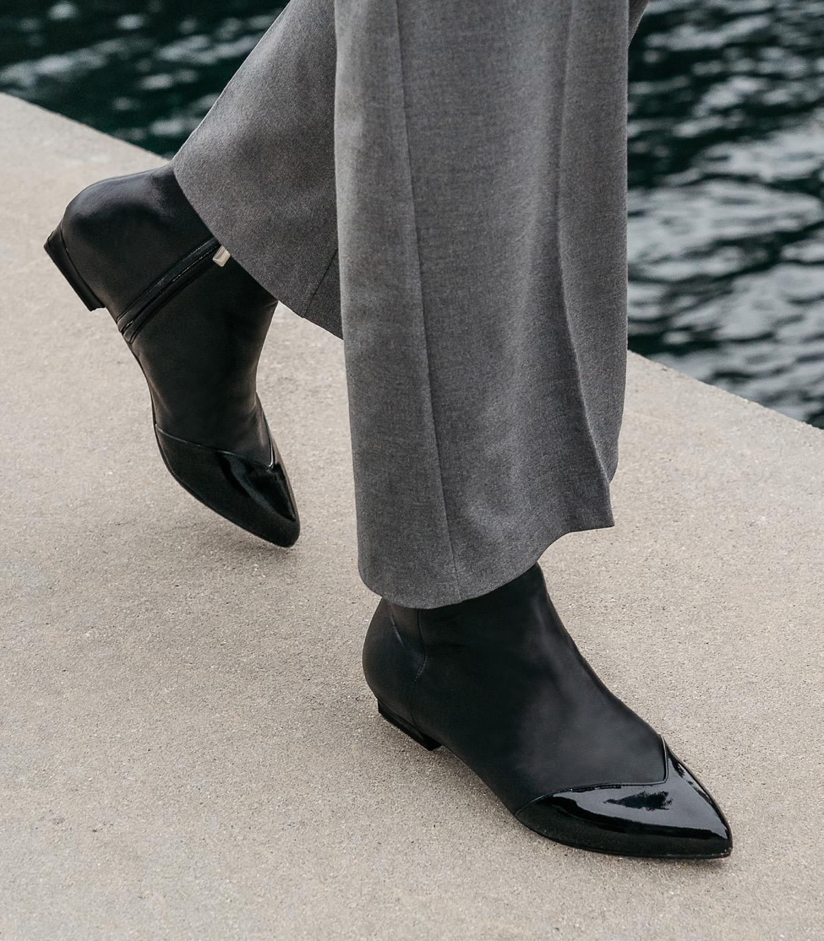 She is based on our bestselling icon ballerina lola black, with the same lovely details. She is made of soft nappa leather with an elegant heart-shaped salmon knot, which gives her a classic look with a little extra edge. Perfect for everyday use and as pretty black boots for a festive look. We have designed the shaft low so that she can fit all legs. The forefoot has 2mm extra space, so she fits both wide and narrow feet.