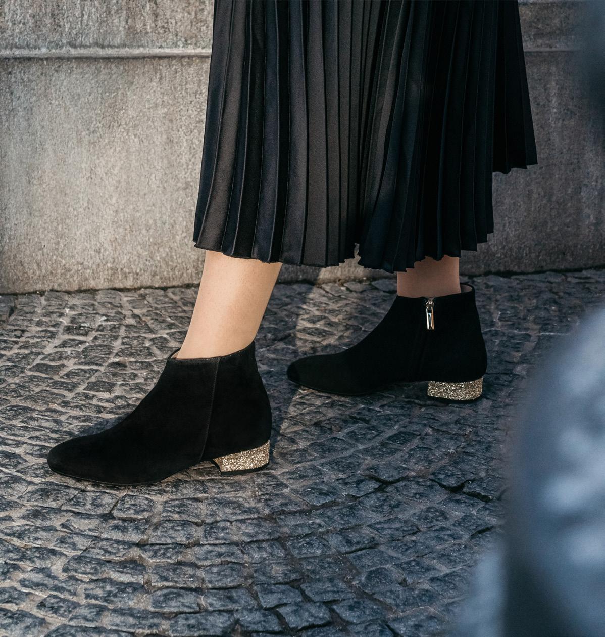 This boot is a showstopper with its 2,5 cm glitter heel and square toe. Made of luxurious Italian suede material, it’s the perfect mix of style and comfort. The low-cut design is perfect to fit all legs and add a touch of elegance to any outfit. So whether you’re hitting the town or the office, this boot has got you covered. Get ready to turn.