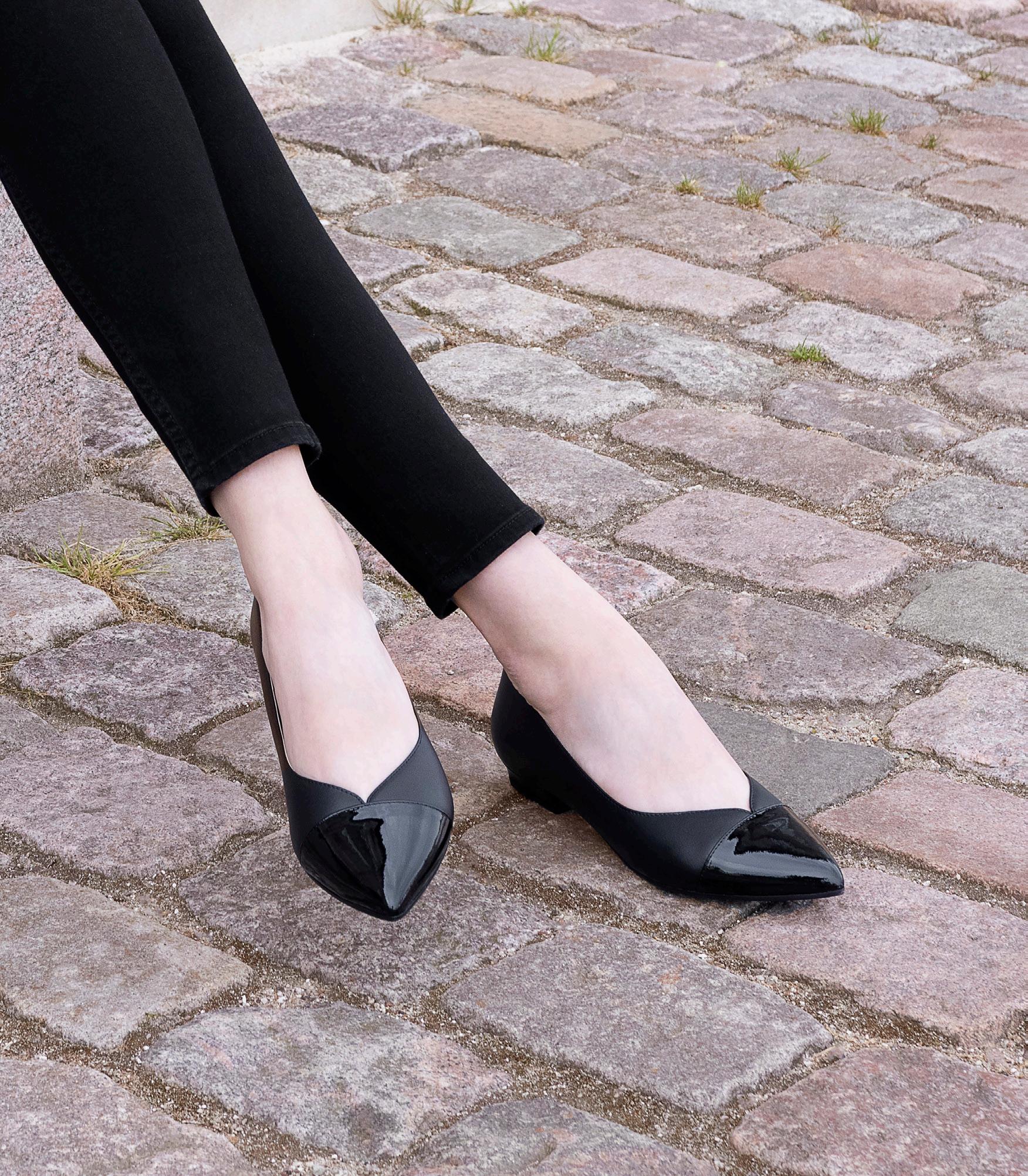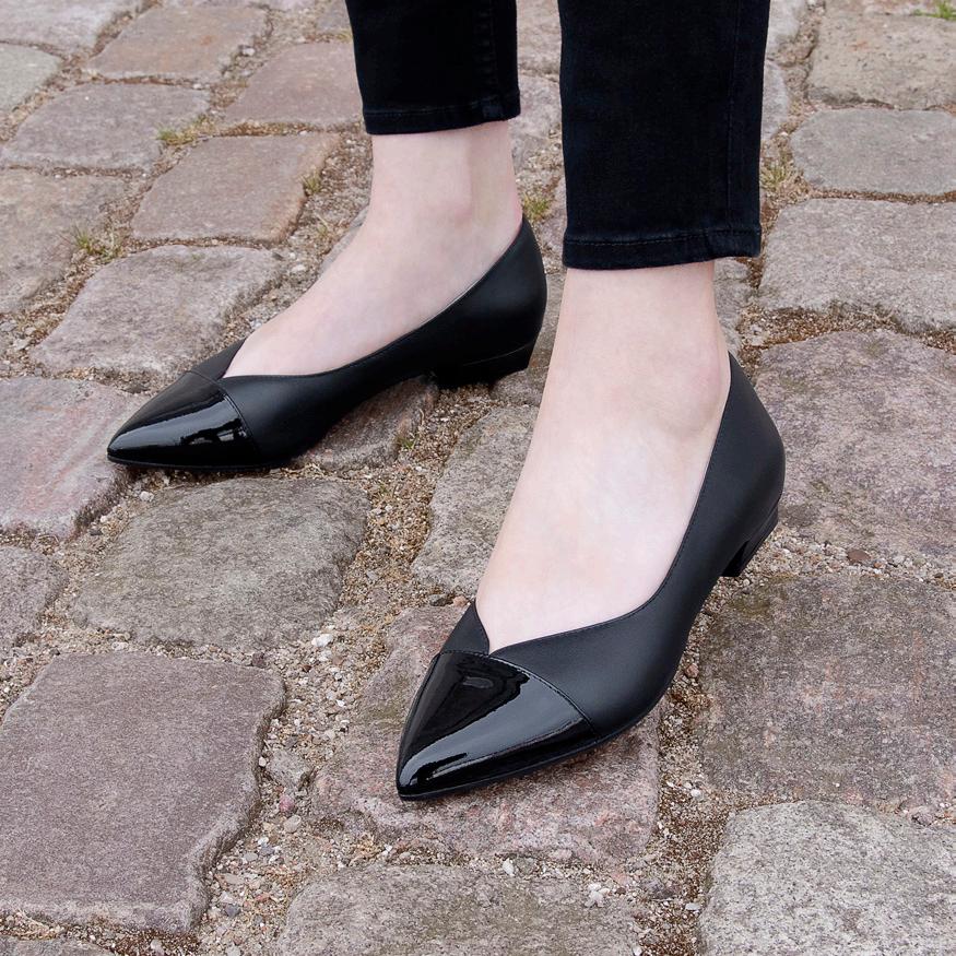 A comfortable ballerina with a 2.5 cm heel, made with a mixture of black Nappa leather and patent leather.
