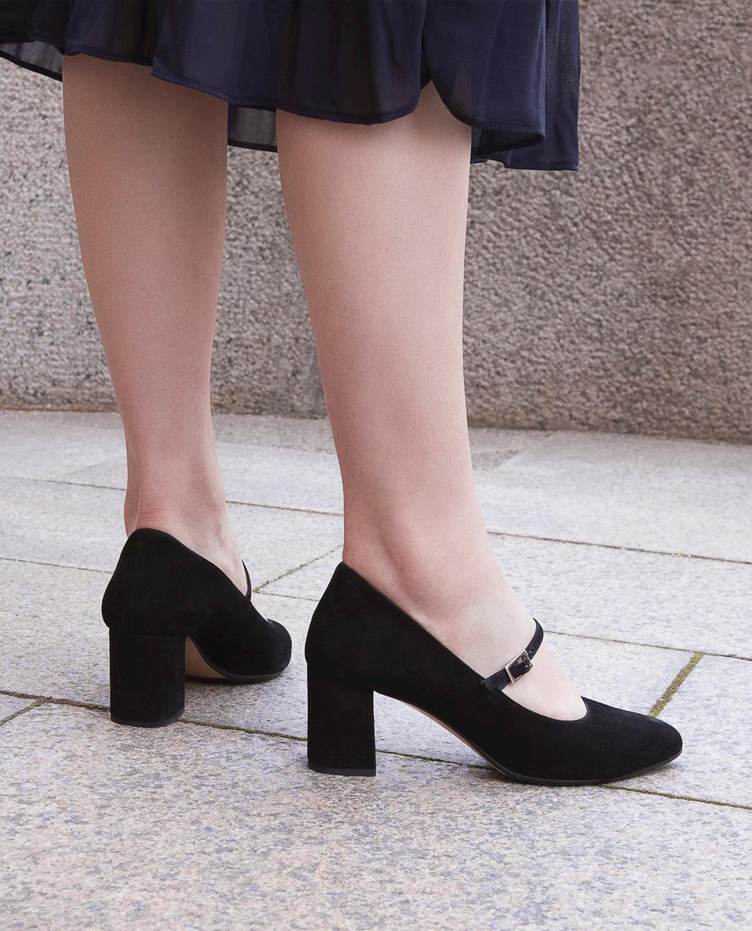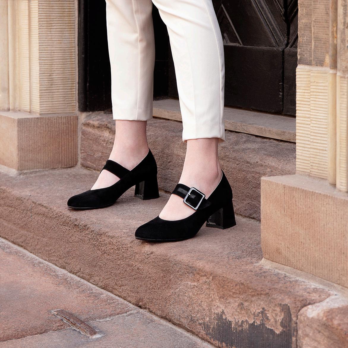 A practical and fun block heel pump, made from soft suede and featuring a patent leather heel and buckle. Ideal for a day in the office or out in the city, with a 5 cm heel.