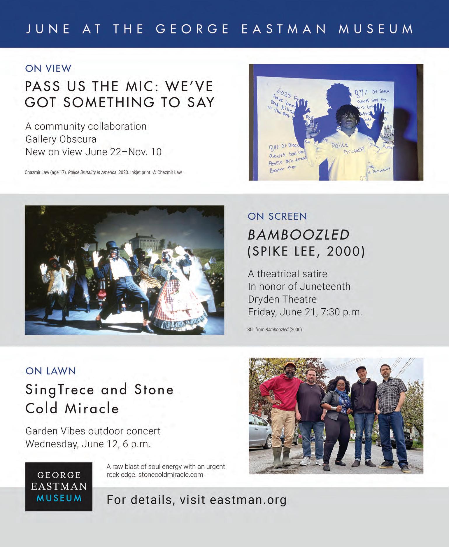 or transmitted in any form or by any means, electronic or mechanical, photocopying, recording or by any information storage retrieval system without permission of the copyright owner. WXXI Members may inquire about free home delivery of CITY including monthly TV listings by calling 585-258-0200. ARTS. MUSIC. CULTURE. @ROCCITYMAG JUNE 2024 | Vol. 52 No. 10 photo the city On the cover: