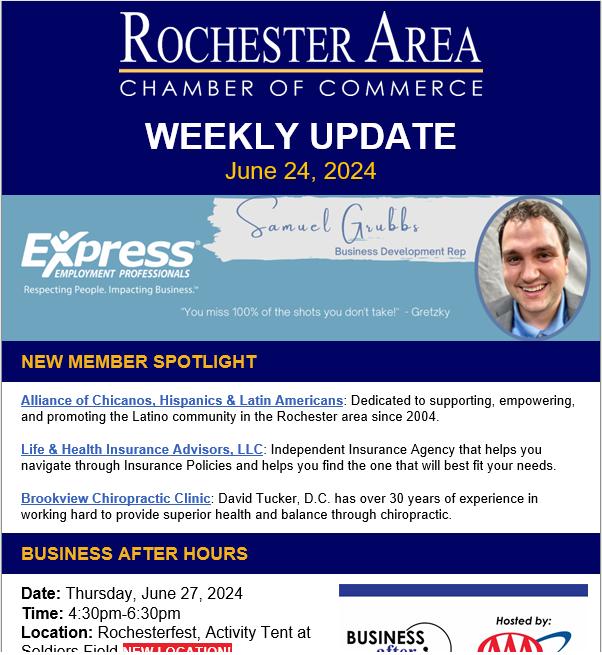 • Ad artwork and link must be sent to svanoss@rochestermnchamber.com a business day prior to being sent out. For example, Weekly Update ad artwork and link will need to be received by Friday afternoon to be included in the following Monday’s Weekly Update. The link sent can be to a website, PDF file, YouTube video, or email address.
