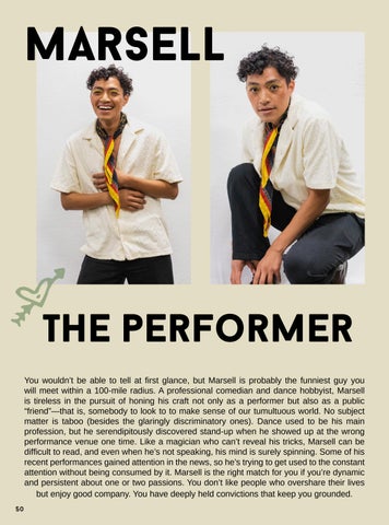 athe performer You wouldn’t be able to tell at first glance, but Marsell is probably the funniest guy you will meet within a 100-mile radius. A professional comedian and dance hobbyist, Marsell is tireless in the pursuit of honing his craft not only as a performer but also as a public “friend”—that is, somebody to look to to make sense of our tumultuous world. No subject matter is taboo (besides the glaringly discriminatory ones). Dance used to be his main profession, but he serendipitously discovered stand-up when he showed up at the wrong performance venue one time. Like a magician who can’t reveal his tricks, Marsell can be difficult to read, and even when he’s not speaking, his mind is surely spinning. Some of his recent performances gained attention in the news, so he’s trying to get used to the constant attention without being consumed by it. Marsell is the right match for you if you’re dynamic and persistent about one or two passions. You don’t like people who overshare their lives but enjoy good company. You have deeply held convictions that keep you grounded. 50
