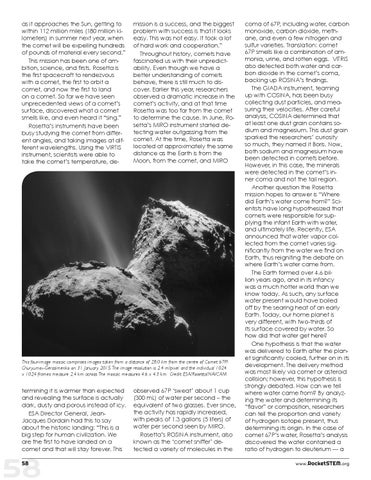 coma of 67P, including water, carbon monoxide, carbon dioxide, methane, and even a few nitrogen and sulfur varieties. Translation: comet 67P smells like a combination of ammonia, urine, and rotten eggs. VITRIS also detected both water and carbon dioxide in the comet’s coma, backing up ROSINA’s findings. The GIADA instrument, teaming up with COSINA, has been busy collecting dust particles, and measuring their velocities. After careful analysis, COSINA determined that at least one dust grain contains sodium and magnesium. This dust grain sparked the researchers’ curiosity so much, they named it Boris. Now, both sodium and magnesium have been detected in comets before. However, in this case, the minerals were detected in the comet’s inner coma and not the tail region. Another question the Rosetta mission hopes to answer is “Where did Earth’s water come from?” Scientists have long hypothesized that comets were responsible for supplying the infant Earth with water, and ultimately life. Recently, ESA announced that water vapor collected from the comet varies significantly from the water we find on Earth, thus reigniting the debate on where Earth’s water came from. The Earth formed over 4.6 billion years ago, and in its infancy was a much hotter world than we know today. As such, any surface water present would have boiled off by the searing heat of an early Earth. Today, our home planet is very different, with two-thirds of its surface covered by water. So how did that water get here? One hypothesis is that the water was delivered to Earth after the planet significantly cooled, further on in its development. The delivery method was most likely via comet or asteroid collision; however, this hypothesis is strongly debated. How can we tell where water came from? By analyzing the water and determining its “flavor” or composition, researchers can tell the proportion and variety of hydrogen isotope present, thus determining its origin. In the case of comet 67P’s water, Rosetta’s analysis discovered the water contained a ratio of hydrogen to deuterium — a www.RocketSTEM .org