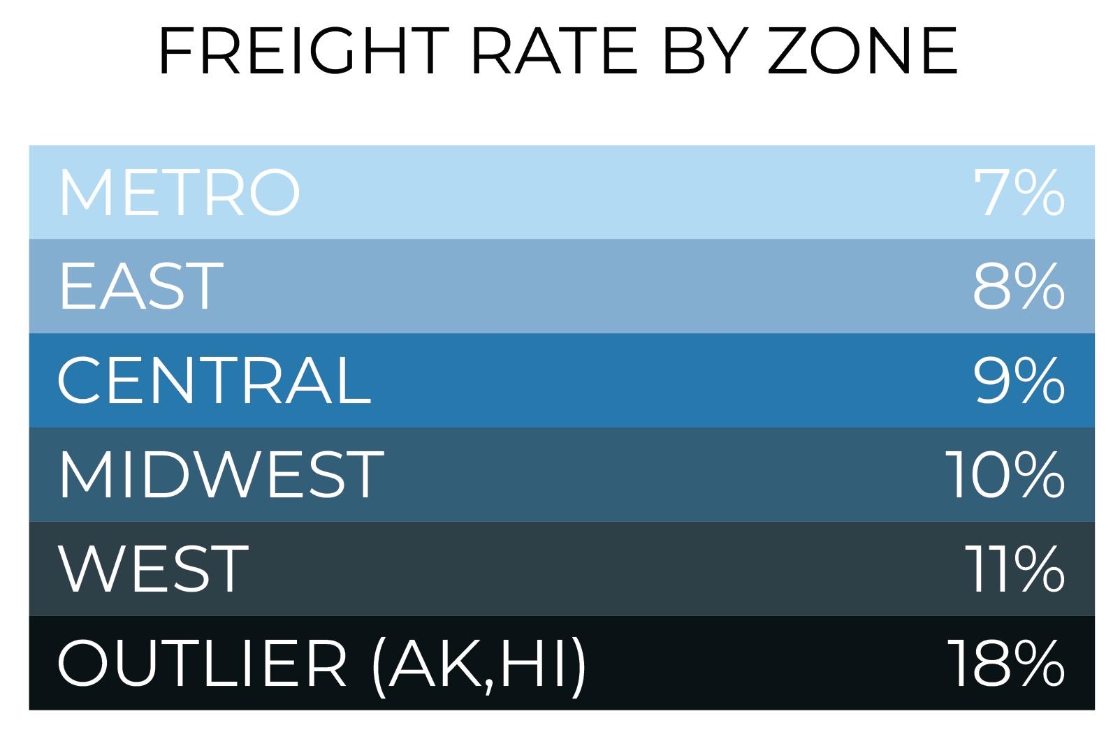 The zone and freight % will also be listed on your Sales Order Confirmation and Shipment Notification. Freight Cost = Invoice Amount x Flat Rate %. If you prefer, we can use your UPS or FedEx shipping account. Please contact Customer Relations Department and provide us with your account number if applicable.