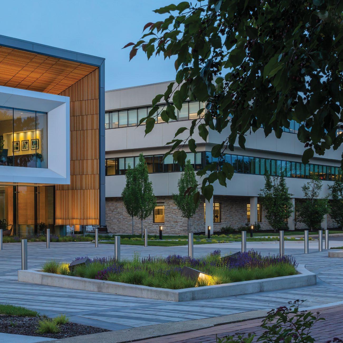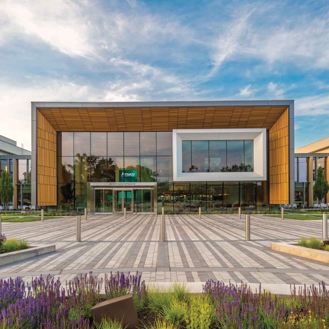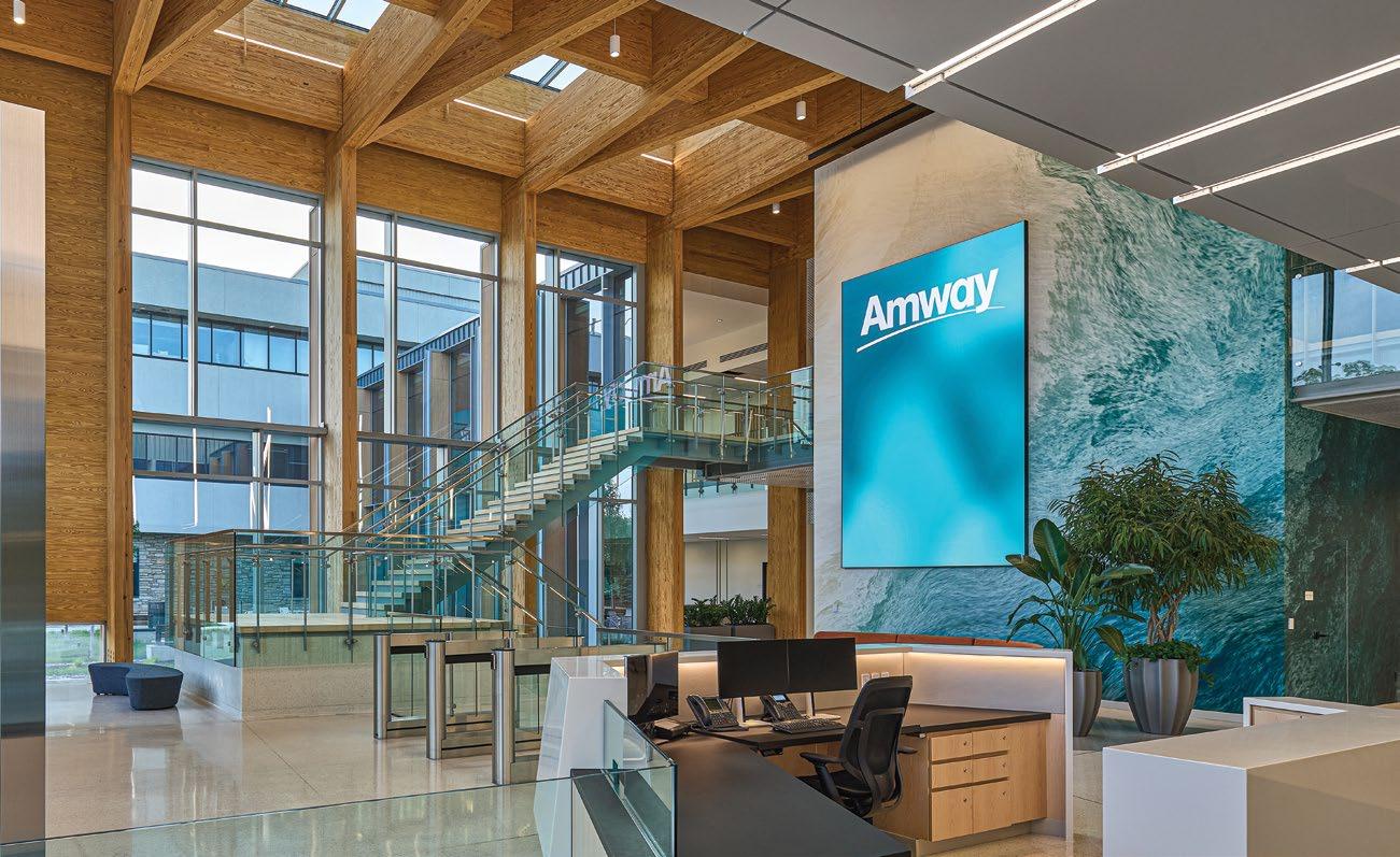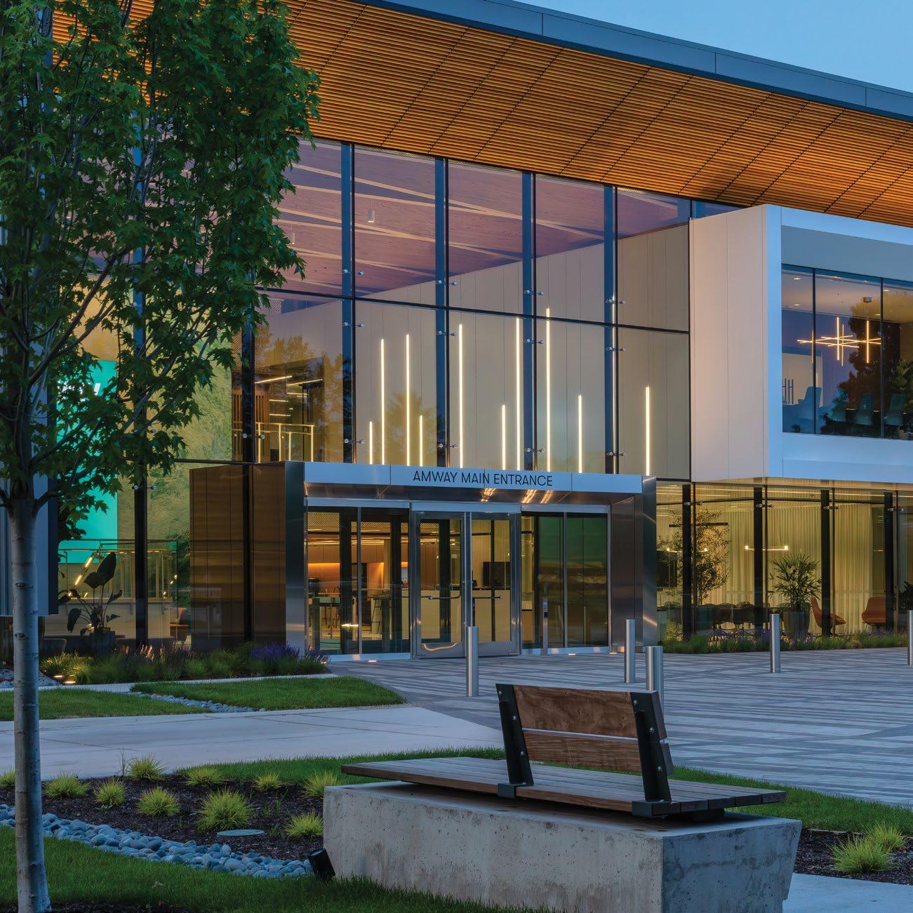 Amway’s newly designed corporate entrance, executive offices, meeting rooms and employee café create a modern, welcoming hub in Ada, Michigan. The entrance combines mass timber and expansive glass walls, maximizing natural light and open, airy spaces. Interior finishes reflect the company’s commitment to quality, fostering an environment that inspires employees and visitors alike. Spanning 60,000 sq. ft., the project blends state-of-the-art design with practical functionality, enhancing both workplace experience and guest engagement.