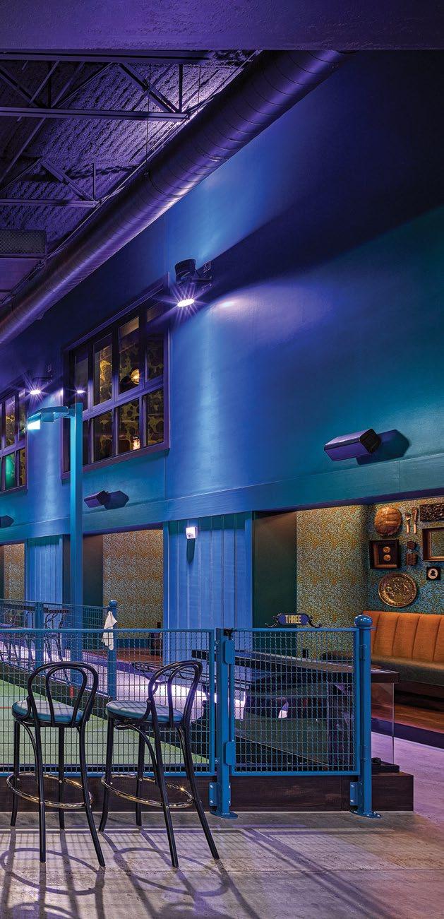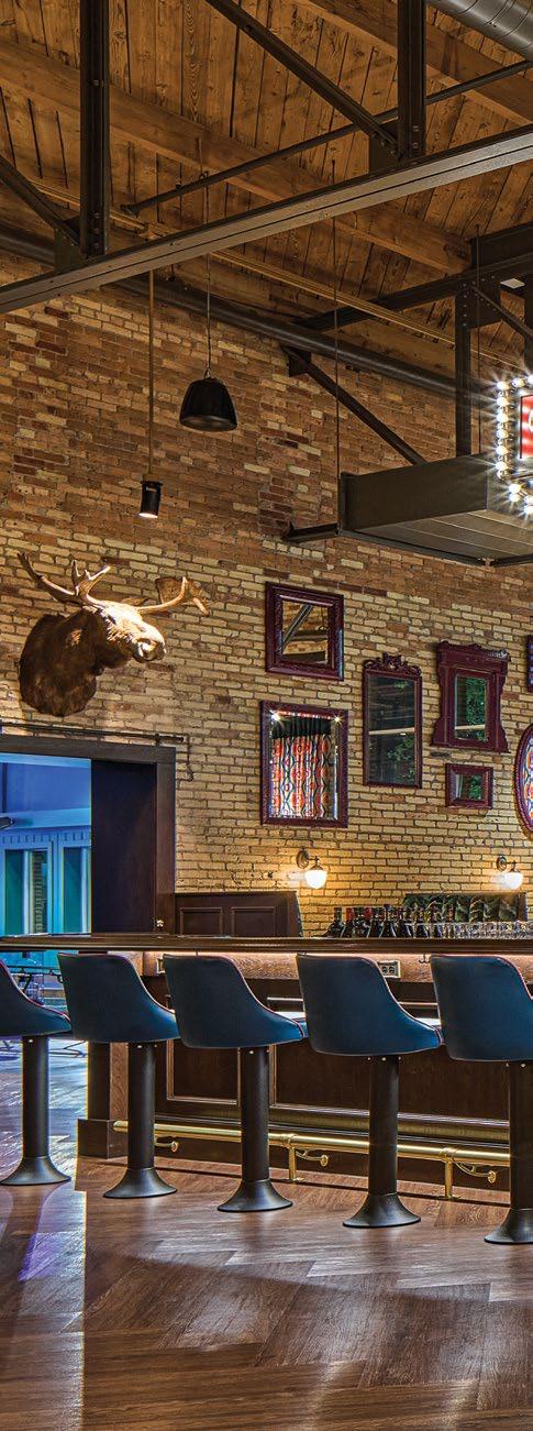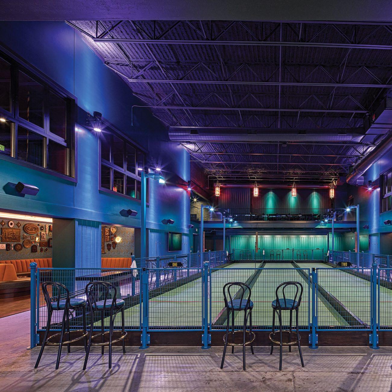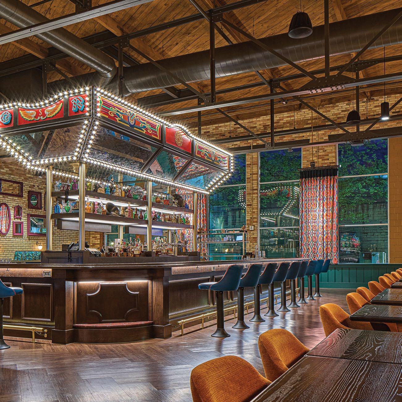 The two-story venue combines a 168-seat restaurant, private dining, five bocce ball courts, a 1,400-person event space, terrace, outdoor dining, recreation areas and a heated indoor parking garage with modern amenities — all while preserving historic character. Design-assist coordination addressed structural challenges and incorporated custom elements, including rare globally sourced materials and bespoke millwork for bars, seating and counters, creating a unique, immersive experience for guests.