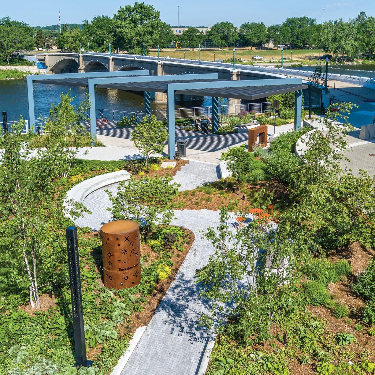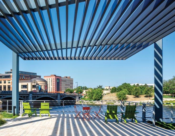 Lyon Square, situated between the DeVos Place Convention Center and the Amway Grand Plaza Hotel, was transformed into a flexible, fourseason riverfront destination that connects people to the Grand River and each other. Upgrades included a snow-melt system, enhanced hardscape, new seating, lighting, trees and open event space, ensuring year-round accessibility. The redesigned park supports river restoration, integrates with the trail system and fosters a culture of engagement and inclusion, creating a vibrant urban gathering place for community events, weddings and everyday enjoyment.