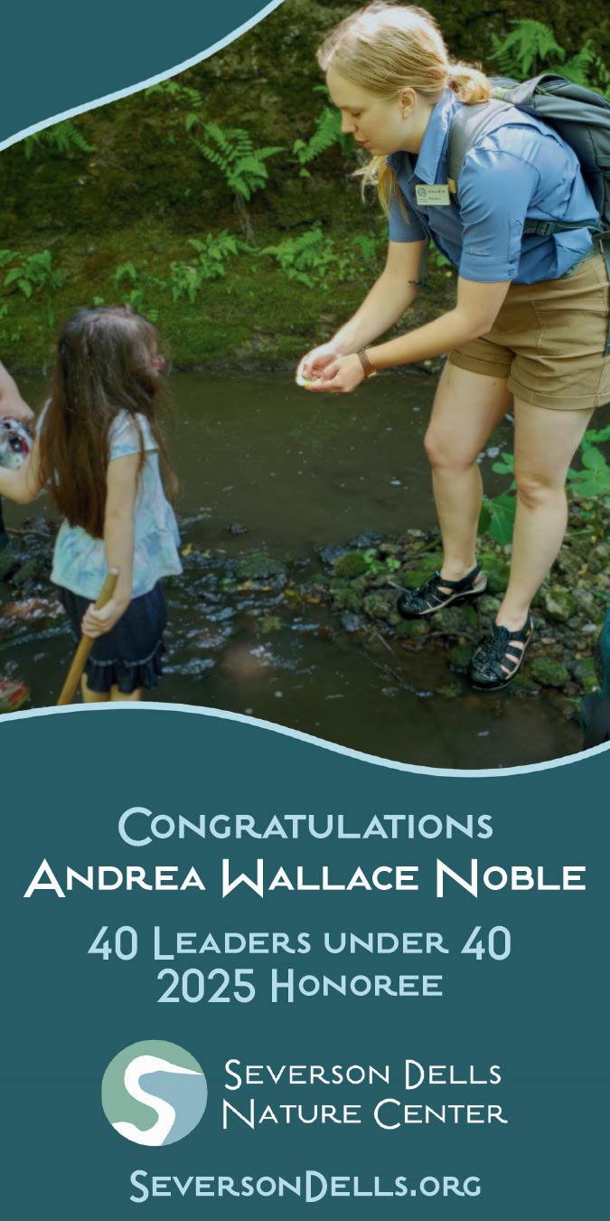 Andrea Wallace Noble has spent her life growing with the trees at Severson Dells. As a curious six-year-old catching crayfish in the creek, she never imagined she’d one day help lead the organization that shaped her love for nature. Today, as education programs manager at Severson Dells Nature Center, Wallace Noble brings that same curiosity and sense of play to every creek walk, community event, and educational initiative she leads. Born and raised in Rockford, Wallace Noble always believed she would return home. After college in Michigan, she came back to the city she loves, one she describes as “diverse, resilient, and beautiful,” and stepped into her dream job. She now works at the intersection of science, education, and advocacy, helping children and adults build meaningful relationships with the natural world.