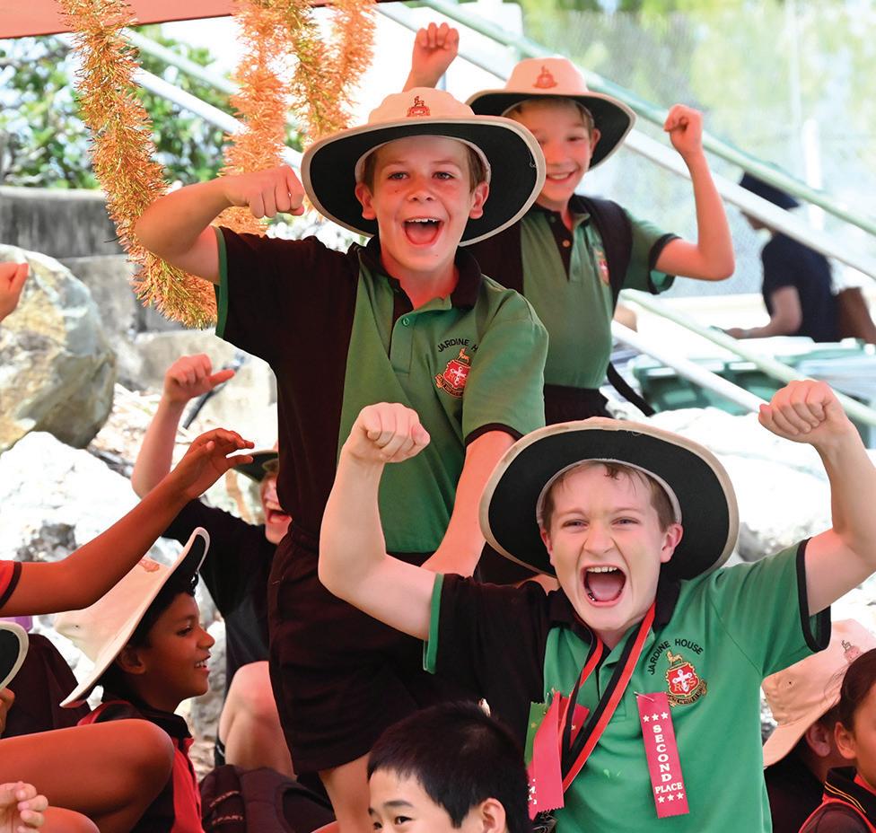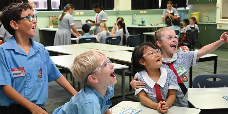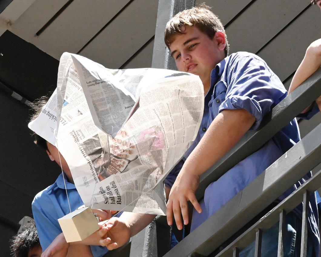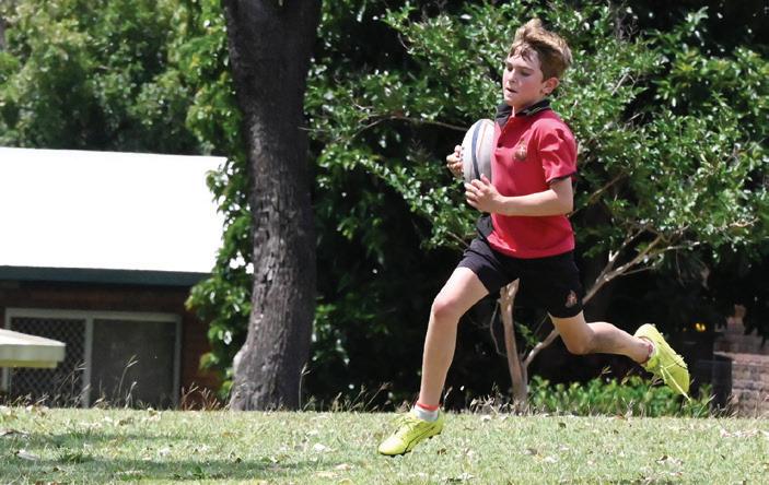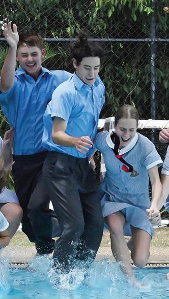 Great Egg Drop; Celebrating the end of school at the Year 12 Valedictory Dinner were Lauren Bainbridge, Medha Koduri, and Abenaya Suntharavadivel; Year 6 Student Leaders Addison Maurer and Elliott Ostwald; Prep’s Seb Madigan joins the signing choir at Carols in the Frame; Year 12 students Justin Sharp, Cayden Kent and Asha Donaghy join the pool jump; Year 8’s Hollie Foot bursts towards the try line at the CQ 7s rugby union carnival; Prep’s Cora Chen in her classroom music lesson; Year 10’s Henry Lau prepares to bat for RGS in the Rockhampton Cricket Men’s Third Grade competition.