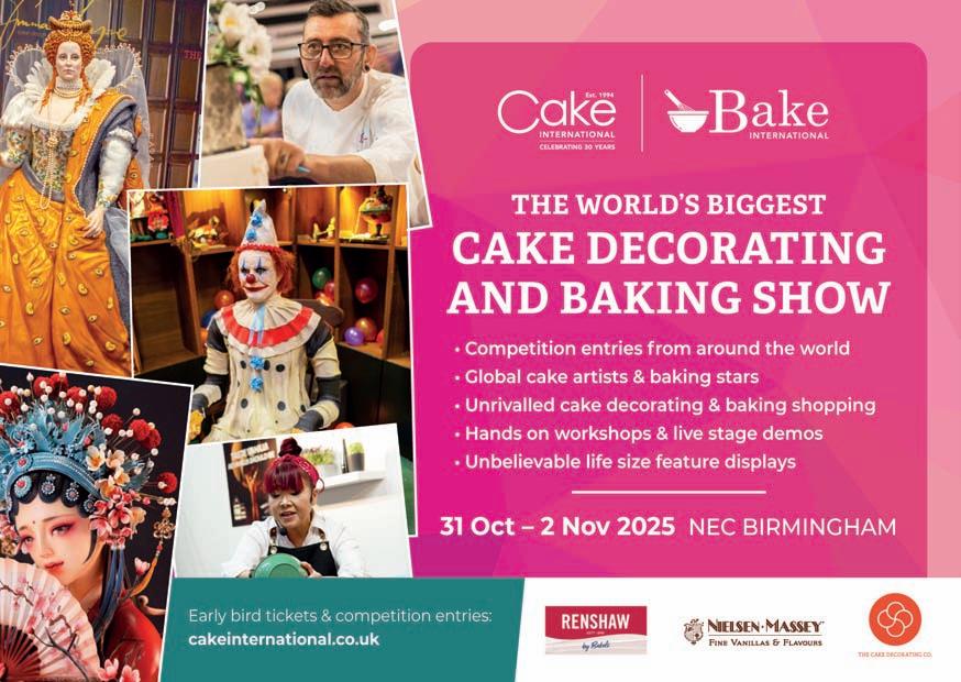 Bigger,bolderandsweeterthanever! That’sthepromisewhenCake InternationalandBakeInternational switchesontheovensandturnsupthe heatonitsreturntotheNECfrom31 Octoberto2November.Theworld’s premiershowforcakemakersandbakers willfeaturemorethan200industryleadingexhibitors,plushands-on workshops,andthelaunchoftheCake& BakeInternationalAwards.Fulldetailsat www.cakeinternational.co.uk