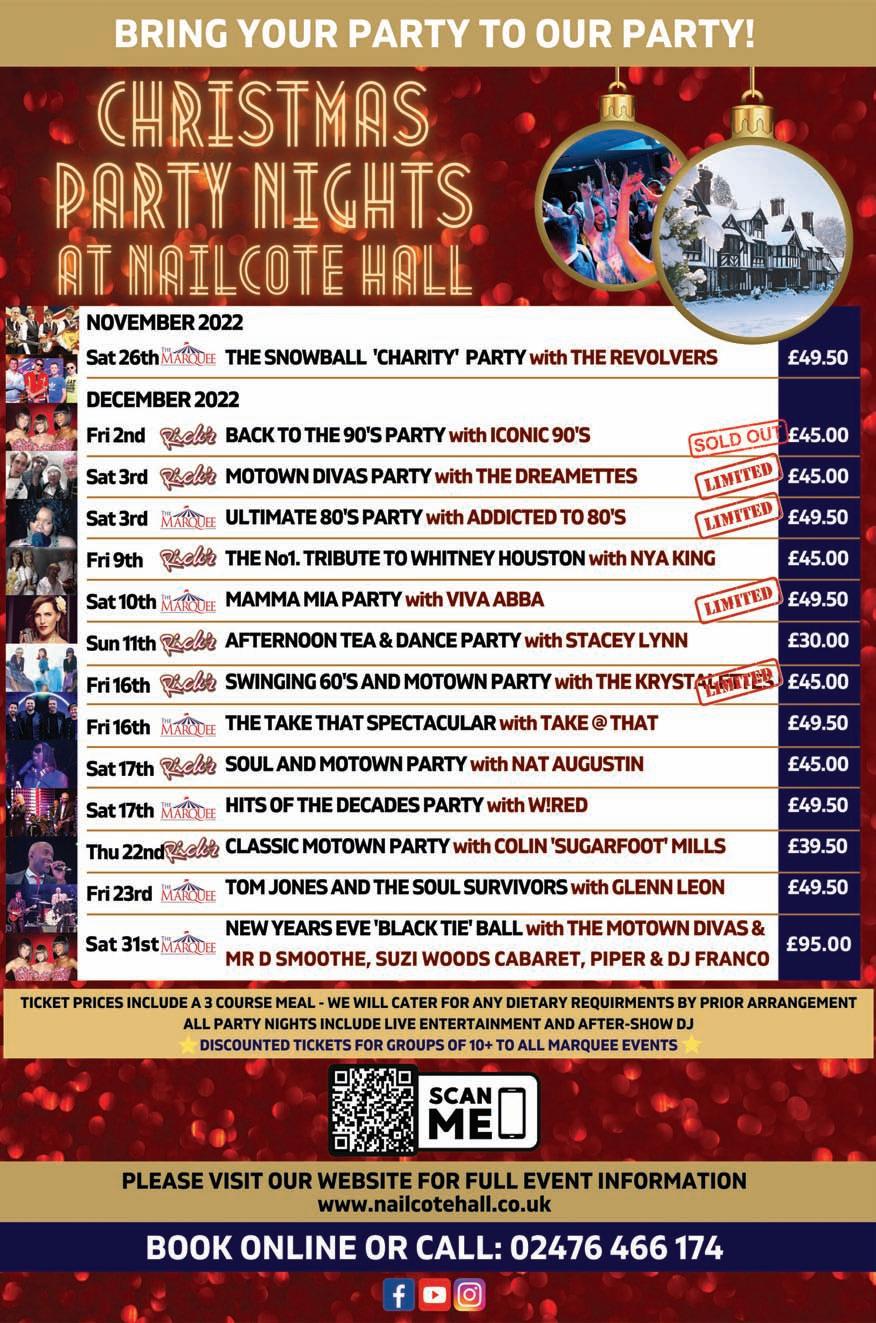 WHERE: NailcoteHall, nailcotehall.co.uk PartywiththeUK’sleadingtributetothegreatestBritishboybandofour generationastheyperformallthehitsandchoreographeddanceroutines. Includesfestivedinnerandafter-showDJ.
