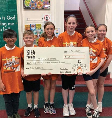 StudentsfromStBrigid’sCatholicPrimarySchool, Northfieldspentthenightsleepingoutinthegardento raisemoneytosupportpeoplewhohaveexperiencedor areatriskofhomelessnessinBirmingham.Thefundraisers–Matteo,Alfie,Millie,Maisie,Esme,Eloiseand Gipir–setouttocollect£250tosupportSIFAFireside butbeattheirtargetwithatotalto£1,500.Thegroupof Year6studentssetupaJustGivingpage,organisedthe camp-outandsoughtsponsorshipaspartoftheir SacramentofConfirmation.