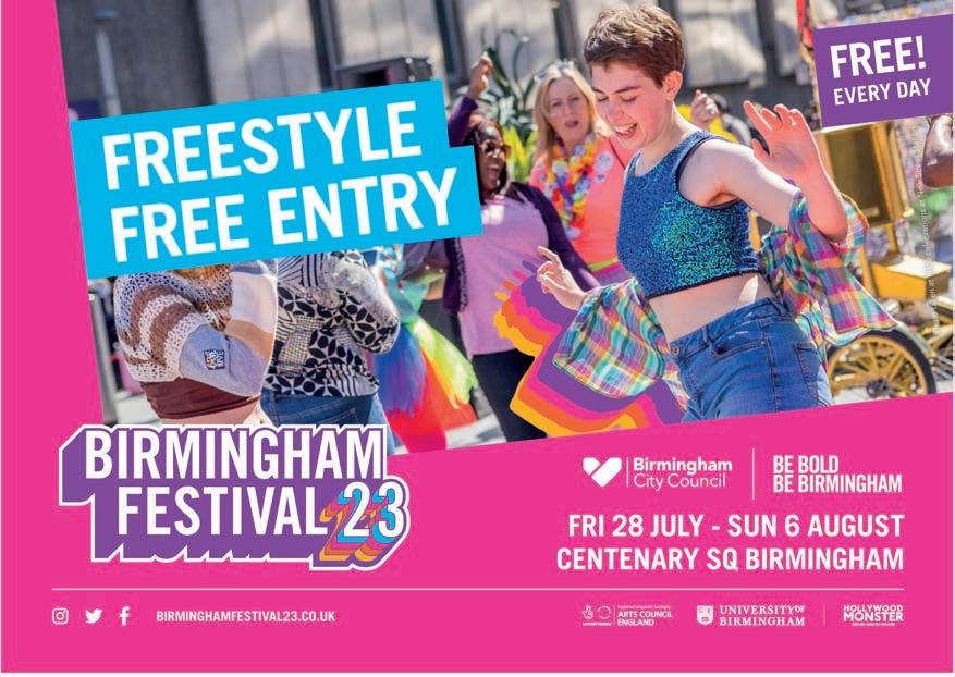 BirminghamFestival23runsfrom28Julyto6August.Forthefull programmeofeventsvisitwww.birminghamfestival23.co.ukand followonsocialmedia:Twitter@bhamfestival23and Instagram@BhamFestival23