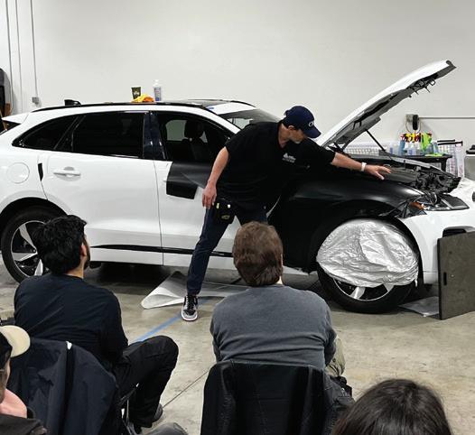 1) An Avery Dennison Supreme Wrapping Film application is demonstrated first before class participants have the opportunity to work with the films themselves. Pictured is instructor Justin Pate, The Wrap Institute. ©2025 Avery Dennison Corporation.